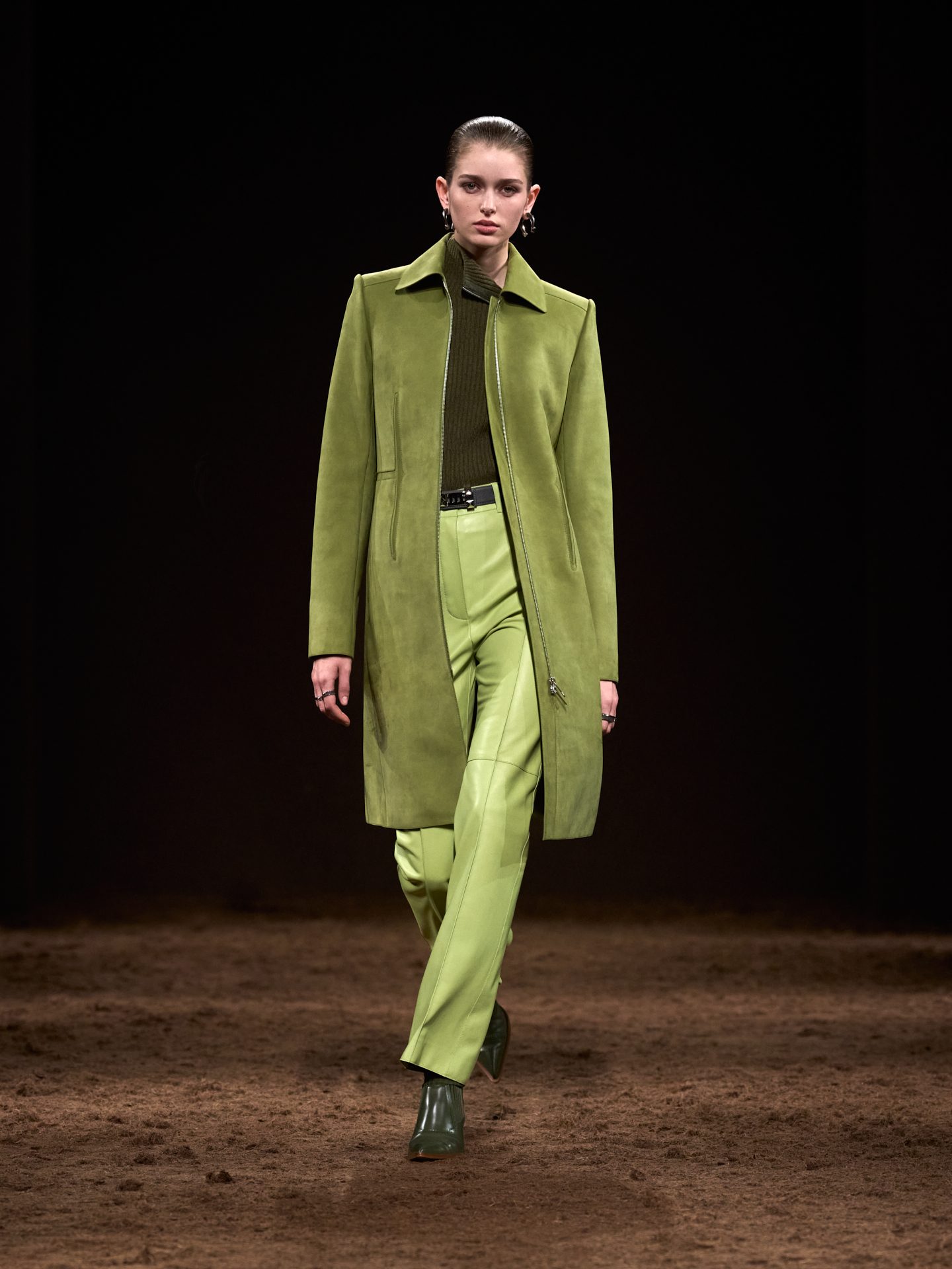 Gilet, giacche matelassè e trench in pelle, tubini in maglia o velluto e look monocolore sfilano alla Paris Fashion Week sulla passerella Autunno/Inverno 2025-2026 di Hermes