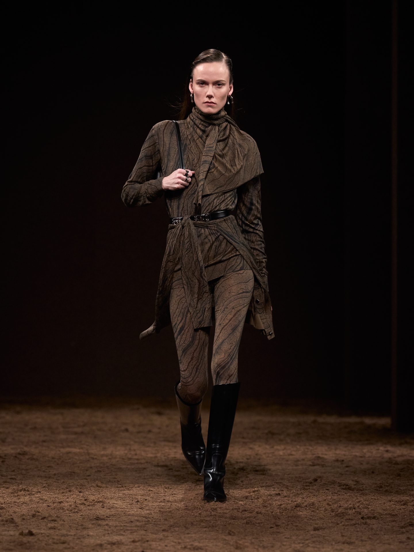 Gilet, giacche matelassè e trench in pelle, tubini in maglia o velluto e look monocolore sfilano alla Paris Fashion Week sulla passerella Autunno/Inverno 2025-2026 di Hermes