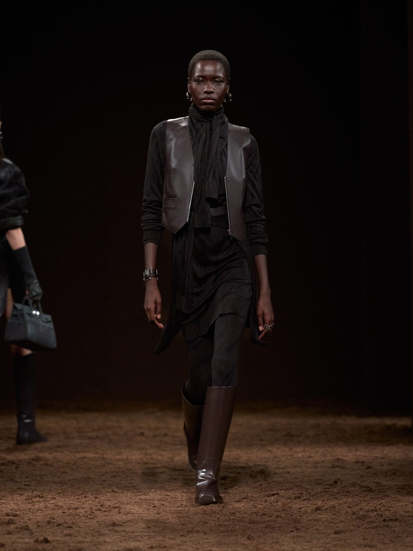 Gilet, giacche matelassè e trench in pelle, tubini in maglia o velluto e look monocolore sfilano alla Paris Fashion Week sulla passerella Autunno/Inverno 2025-2026 di Hermes
