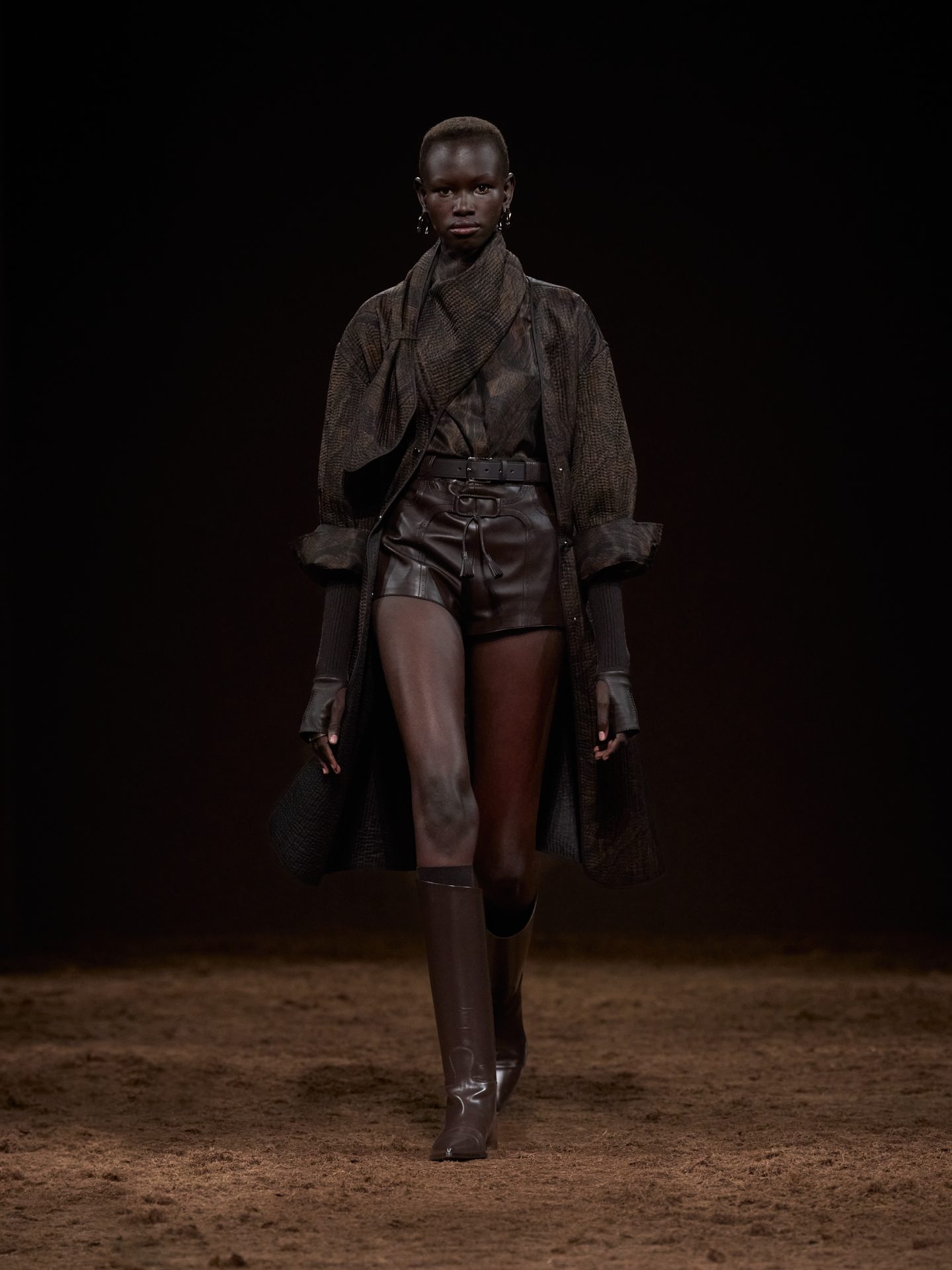 Gilet, giacche matelassè e trench in pelle, tubini in maglia o velluto e look monocolore sfilano alla Paris Fashion Week sulla passerella Autunno/Inverno 2025-2026 di Hermes