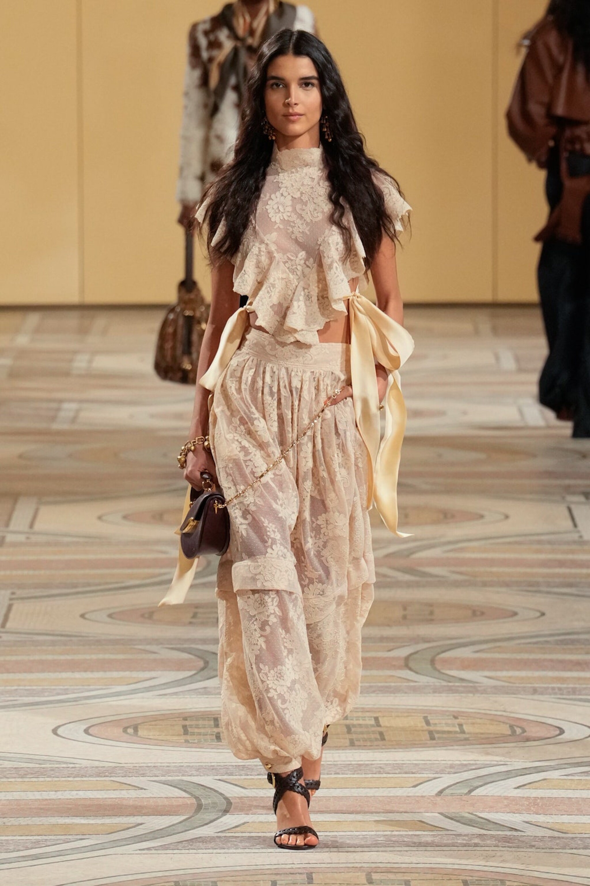 Abiti in pizzo e seta, suits in gessato color panna, ruche e sontuosi drappeggi sfilano alla Paris Fashion Week sulla passerella Autunno/Inverno 2025-2026 di Zimmermann