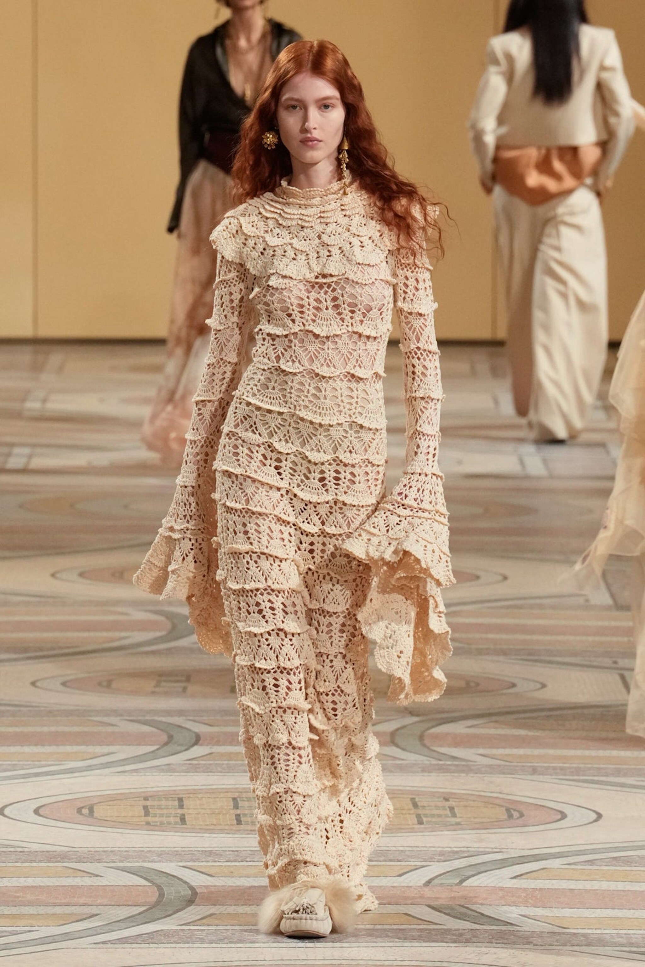 Abiti in pizzo e seta, suits in gessato color panna, ruche e sontuosi drappeggi sfilano alla Paris Fashion Week sulla passerella Autunno/Inverno 2025-2026 di Zimmermann