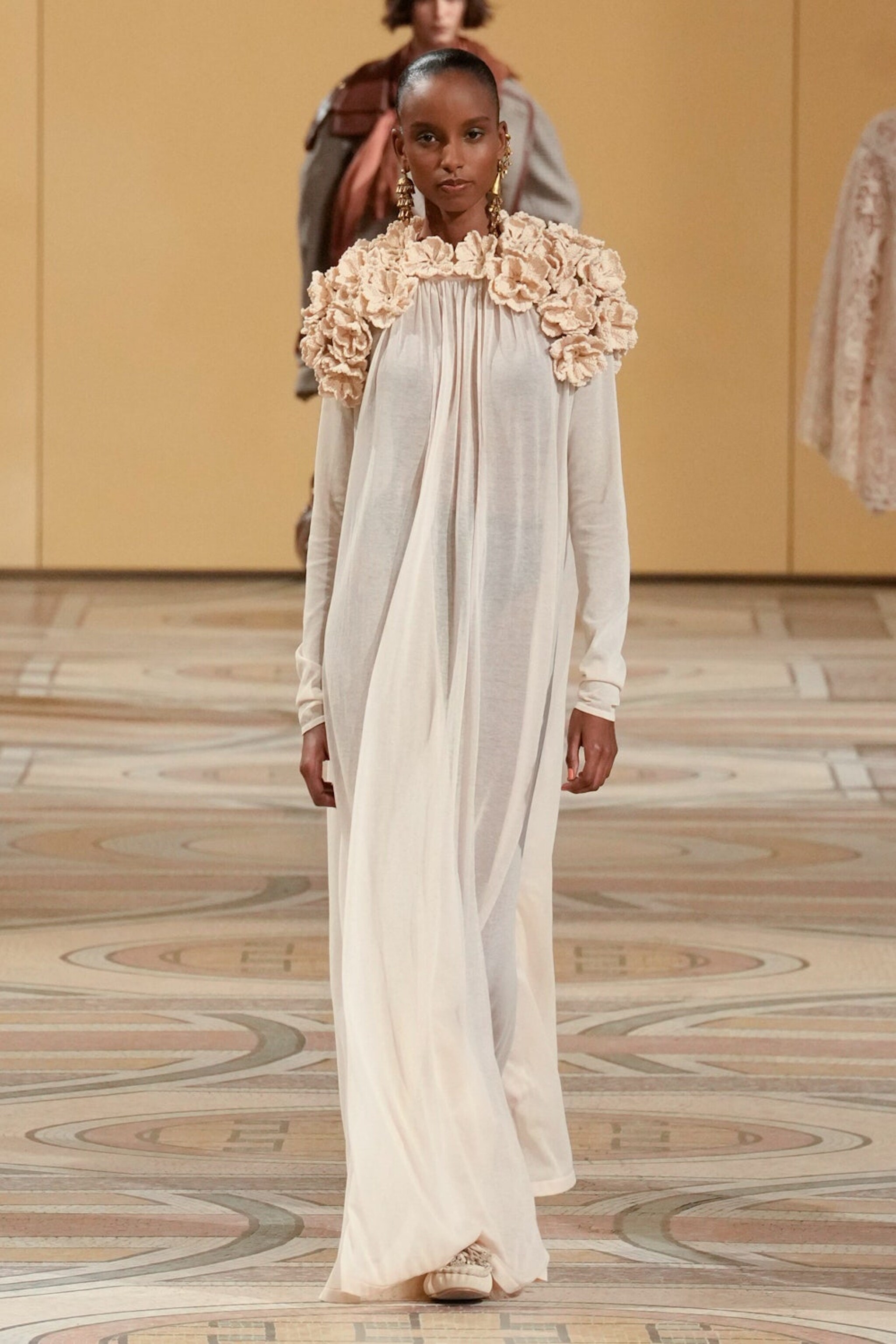 Abiti in pizzo e seta, suits in gessato color panna, ruche e sontuosi drappeggi sfilano alla Paris Fashion Week sulla passerella Autunno/Inverno 2025-2026 di Zimmermann