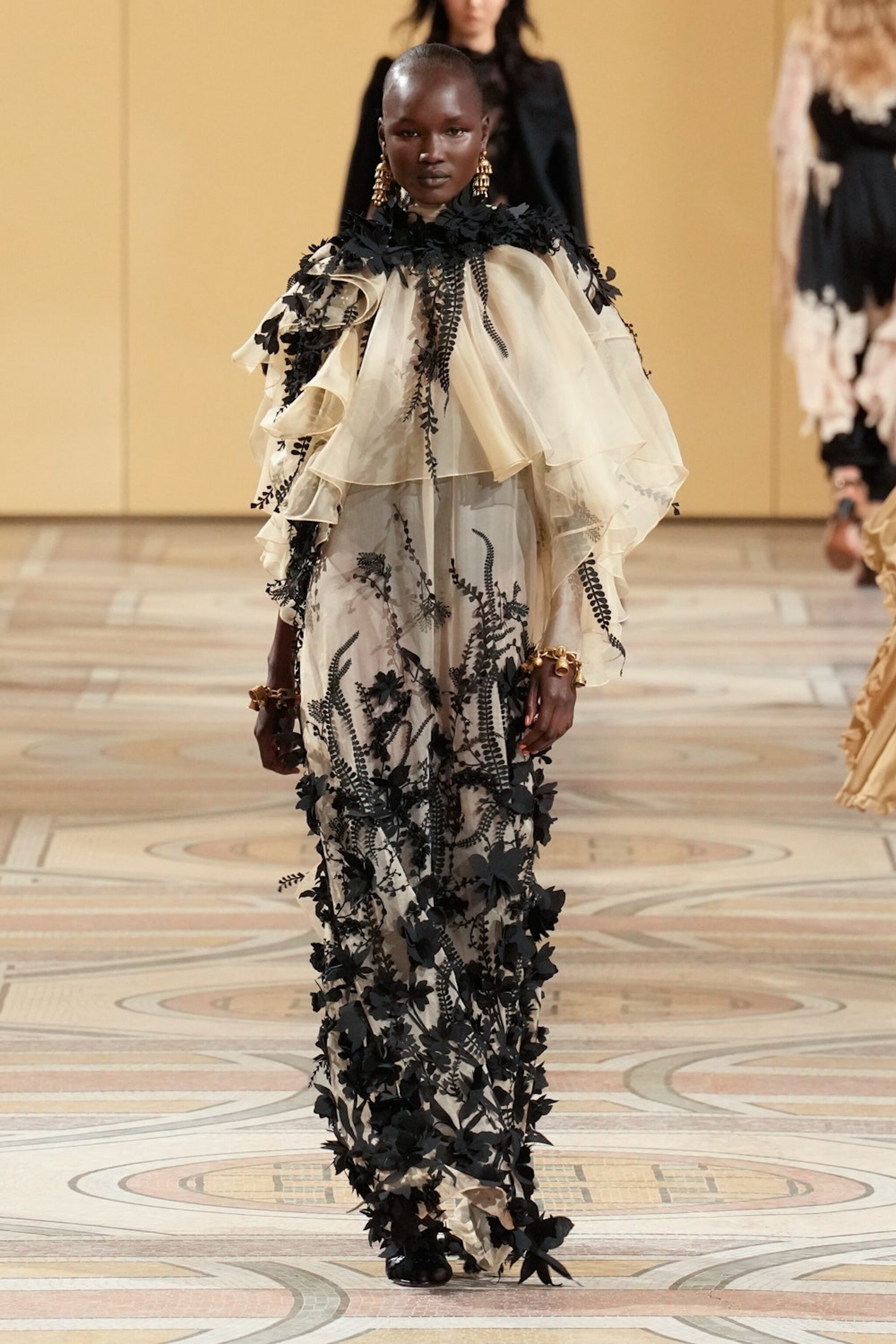 Abiti in pizzo e seta, suits in gessato color panna, ruche e sontuosi drappeggi sfilano alla Paris Fashion Week sulla passerella Autunno/Inverno 2025-2026 di Zimmermann