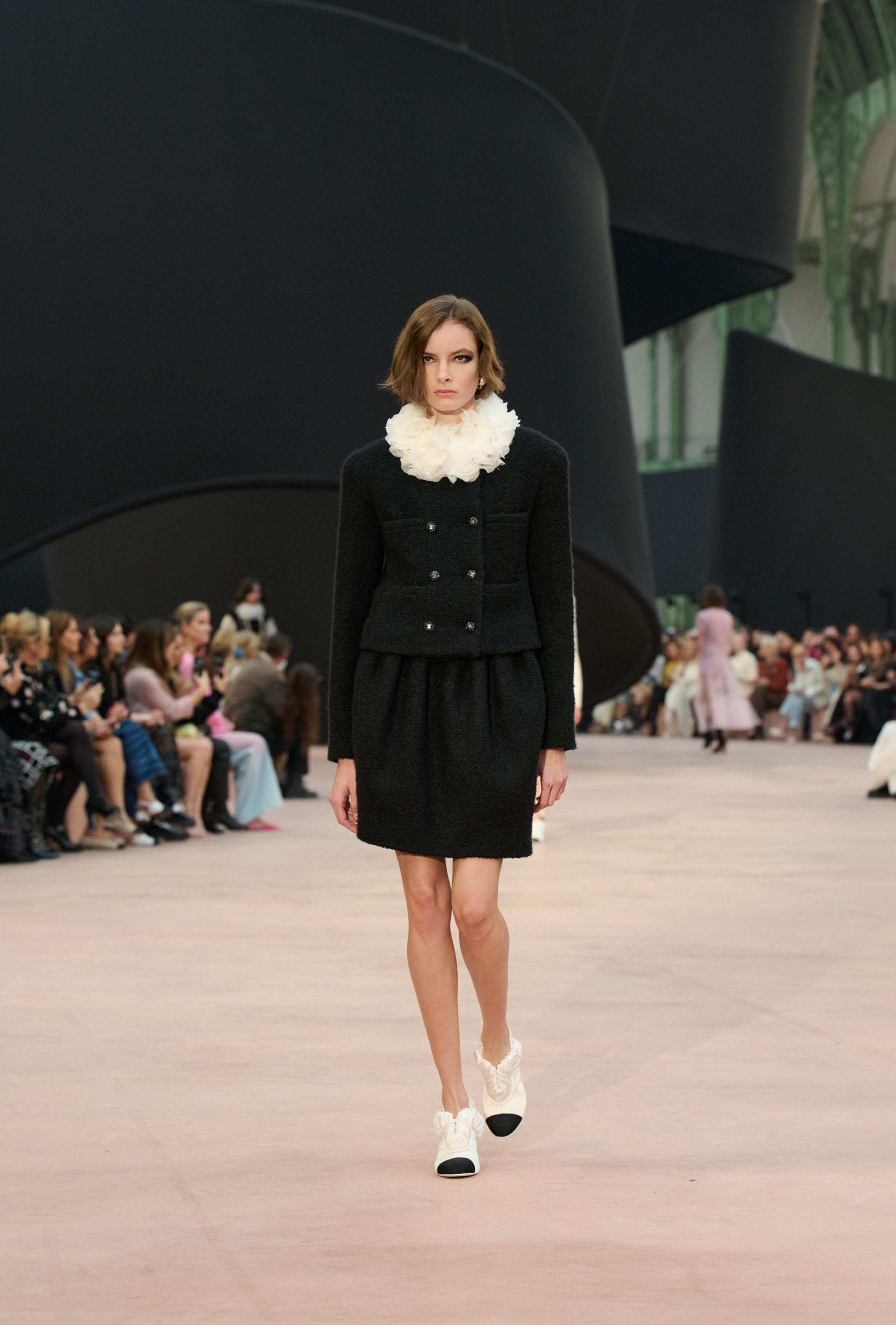 Impalpabili abiti tunica indossati su completi bouclé, gorgiere di ruche, fiocchi e ancora look in vernice nera, perle bold e maxi pull in lana tricot sfilano alla Paris fashion Week sulla passerella Primavera/Estate 2025-2026 di Chanel