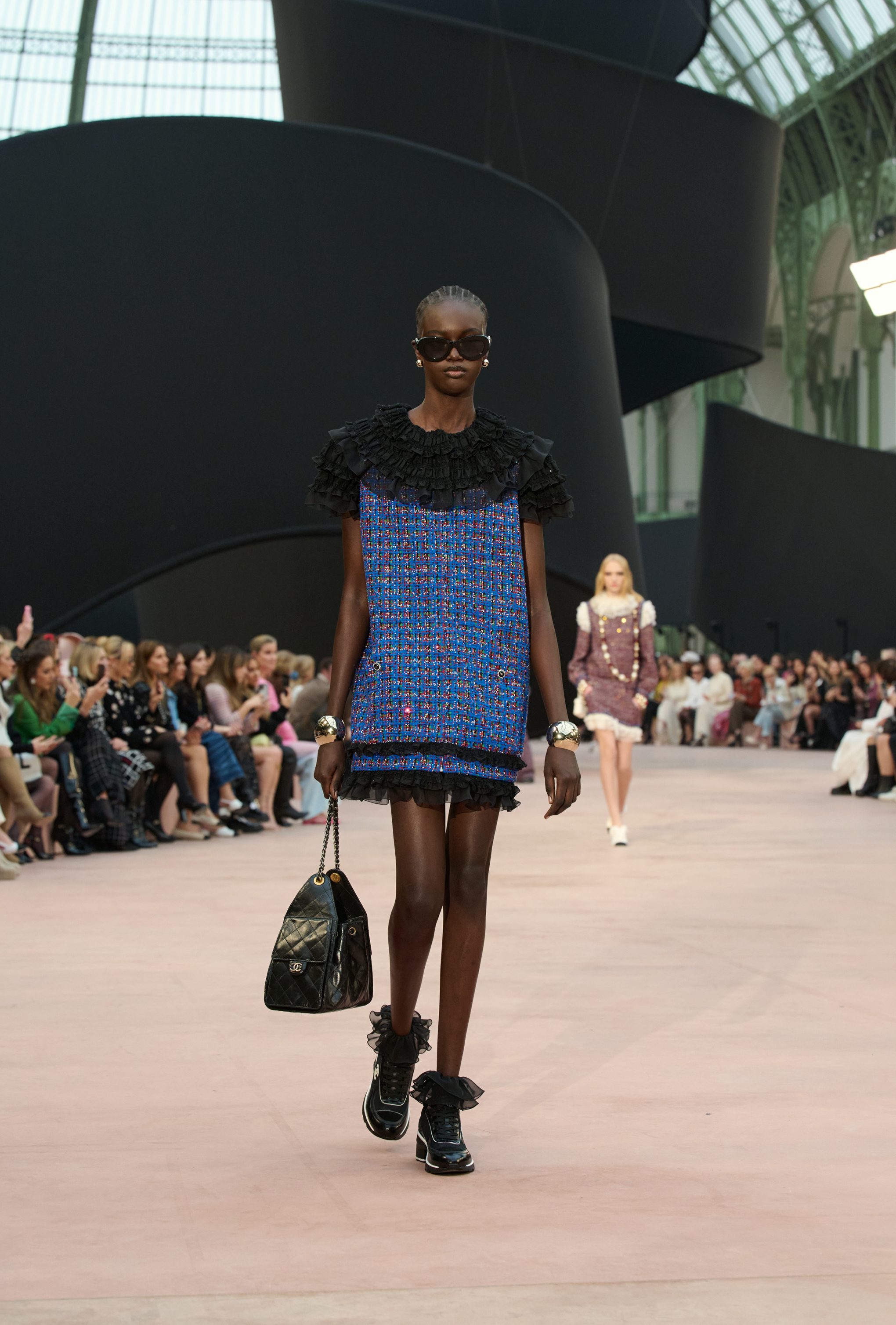 Impalpabili abiti tunica indossati su completi bouclé, gorgiere di ruche, fiocchi e ancora look in vernice nera, perle bold e maxi pull in lana tricot sfilano alla Paris fashion Week sulla passerella Primavera/Estate 2025-2026 di Chanel