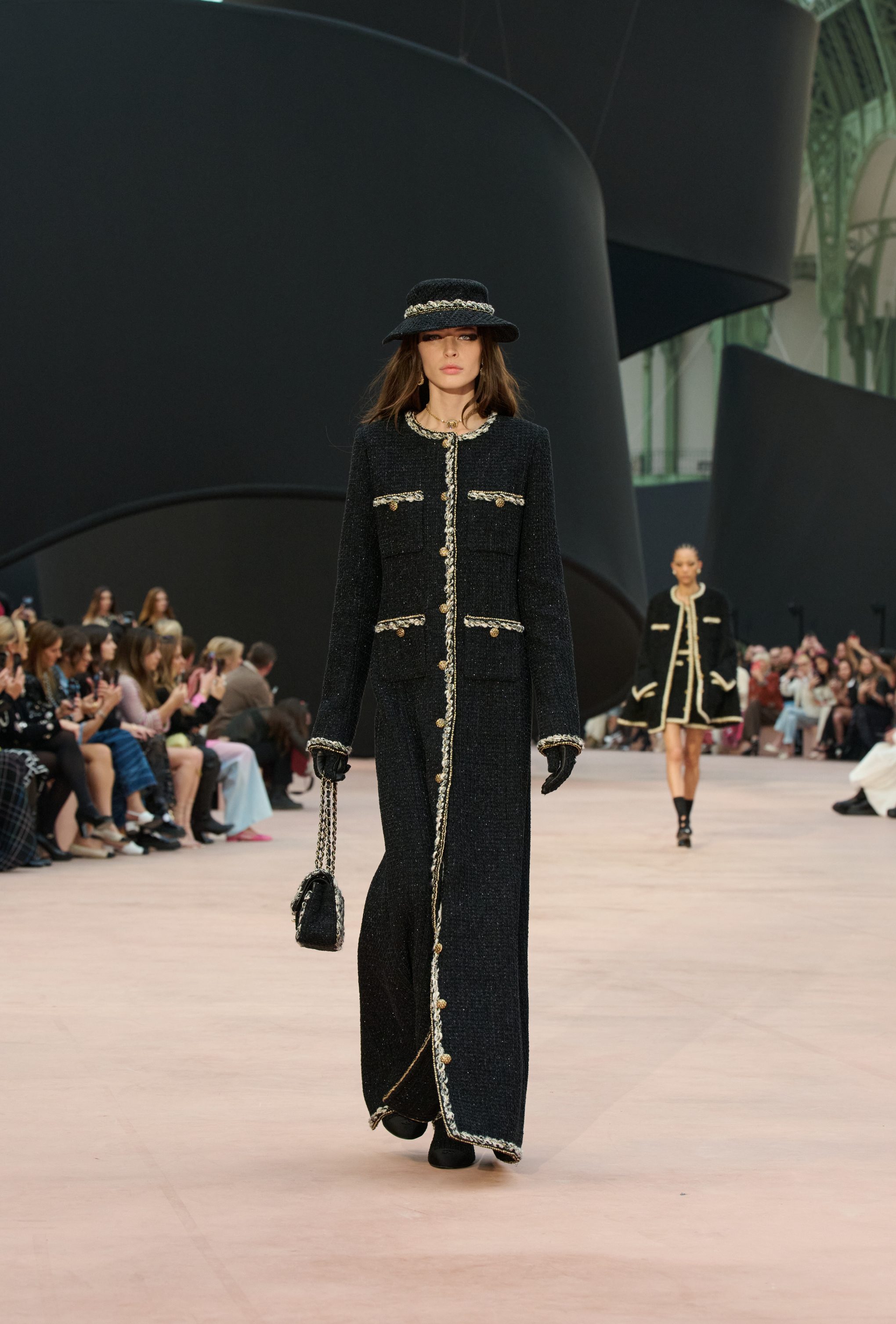 Impalpabili abiti tunica indossati su completi bouclé, gorgiere di ruche, fiocchi e ancora look in vernice nera, perle bold e maxi pull in lana tricot sfilano alla Paris fashion Week sulla passerella Primavera/Estate 2025-2026 di Chanel