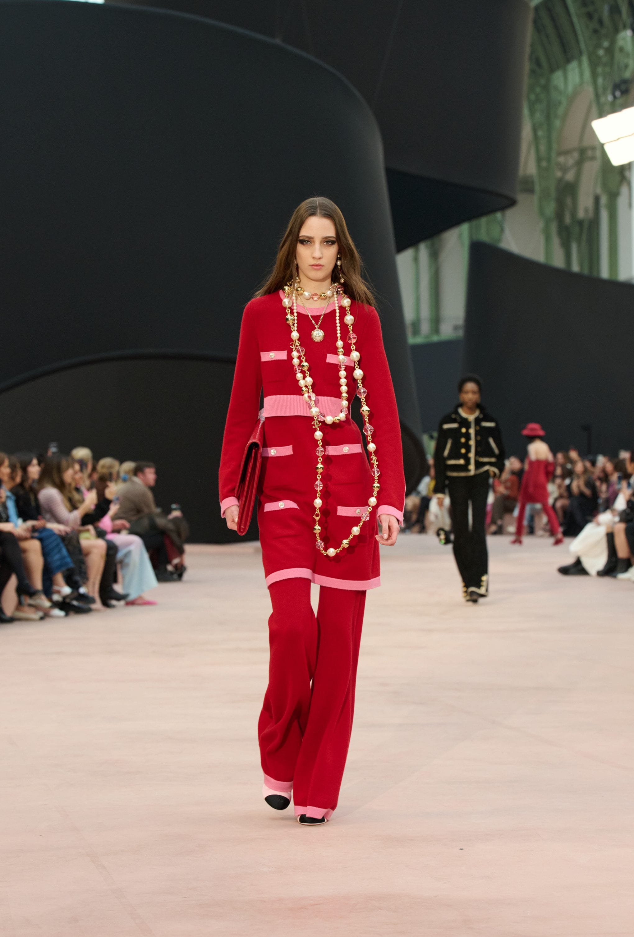 Impalpabili abiti tunica indossati su completi bouclé, gorgiere di ruche, fiocchi e ancora look in vernice nera, perle bold e maxi pull in lana tricot sfilano alla Paris fashion Week sulla passerella Primavera/Estate 2025-2026 di Chanel