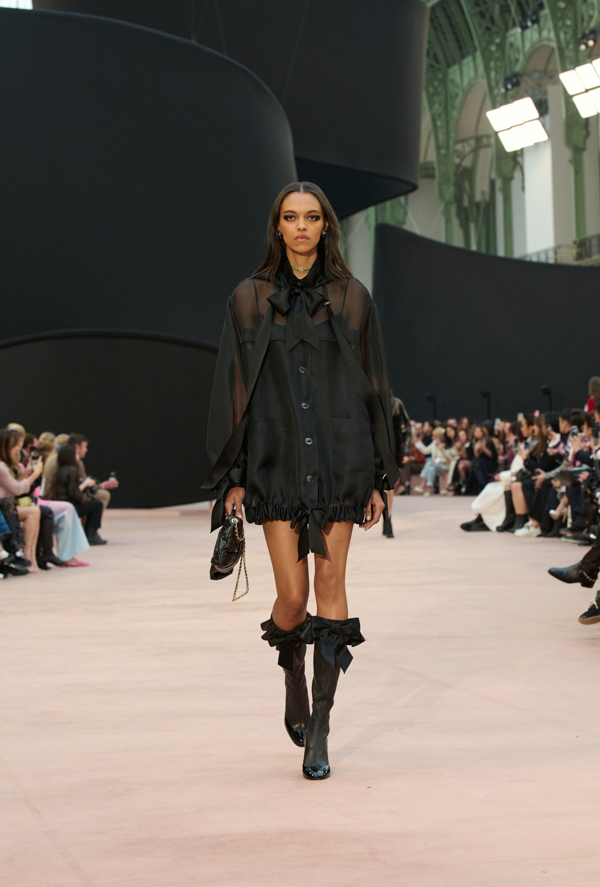 Impalpabili abiti tunica indossati su completi bouclé, gorgiere di ruche, fiocchi e ancora look in vernice nera, perle bold e maxi pull in lana tricot sfilano alla Paris fashion Week sulla passerella Primavera/Estate 2025-2026 di Chanel
