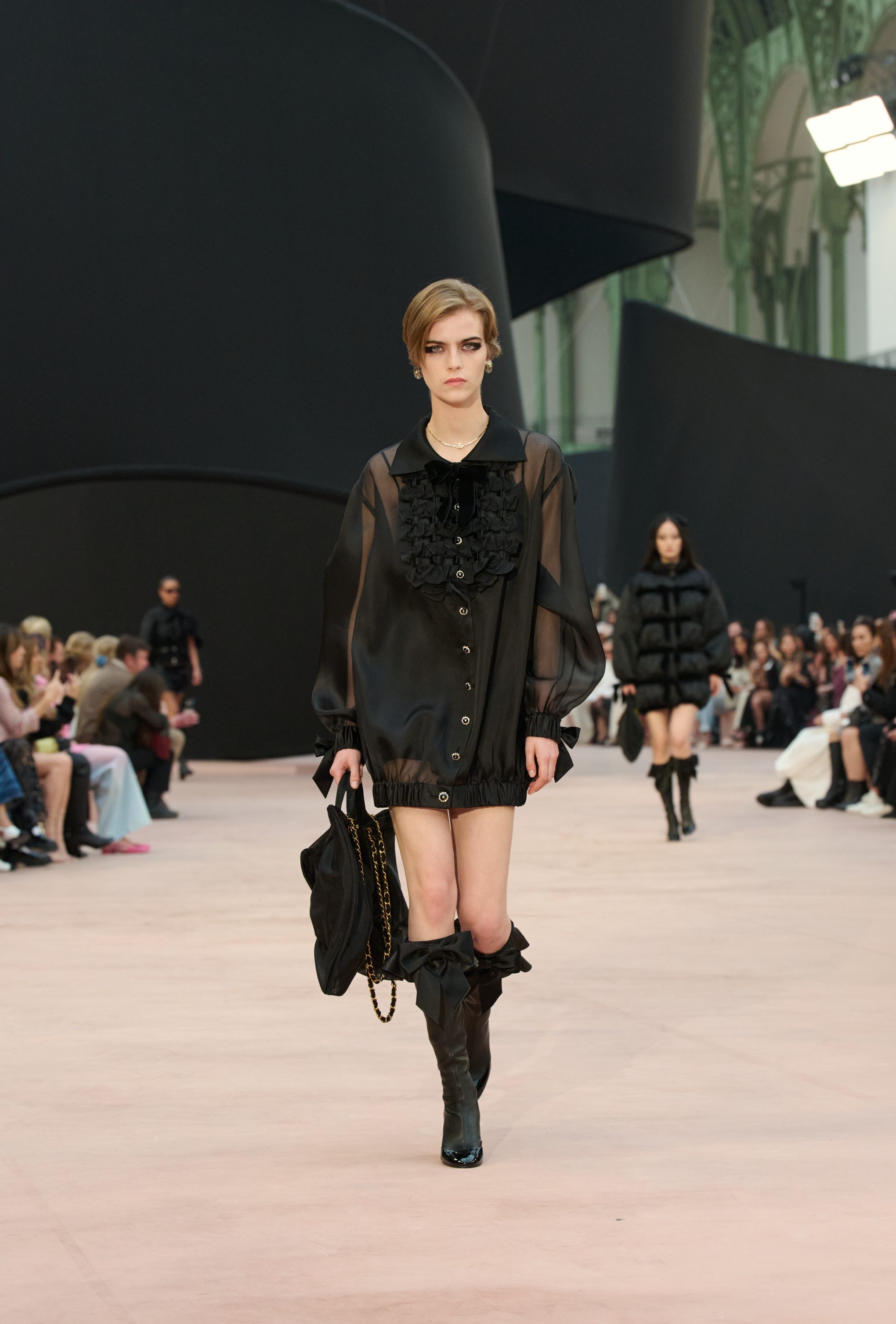 Impalpabili abiti tunica indossati su completi bouclé, gorgiere di ruche, fiocchi e ancora look in vernice nera, perle bold e maxi pull in lana tricot sfilano alla Paris fashion Week sulla passerella Primavera/Estate 2025-2026 di Chanel