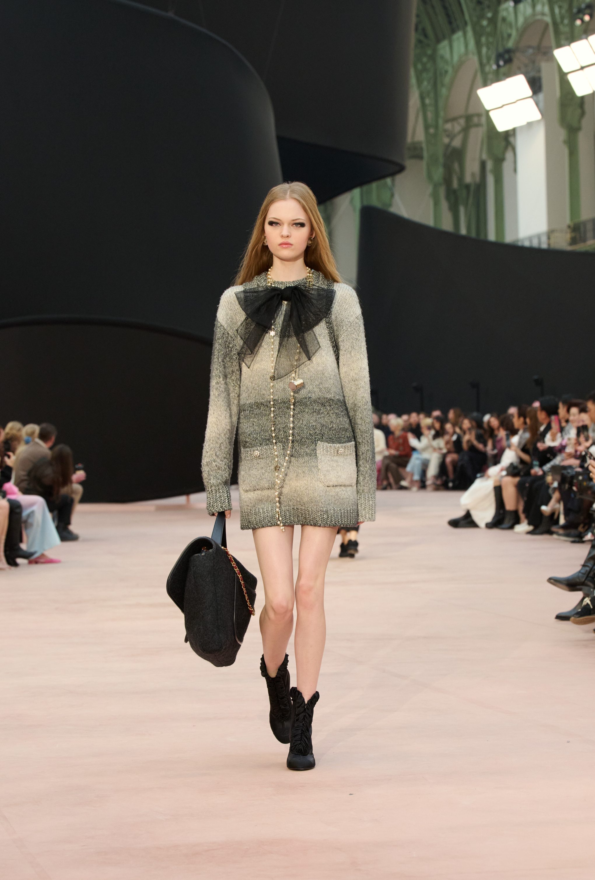 Impalpabili abiti tunica indossati su completi bouclé, gorgiere di ruche, fiocchi e ancora look in vernice nera, perle bold e maxi pull in lana tricot sfilano alla Paris fashion Week sulla passerella Primavera/Estate 2025-2026 di Chanel