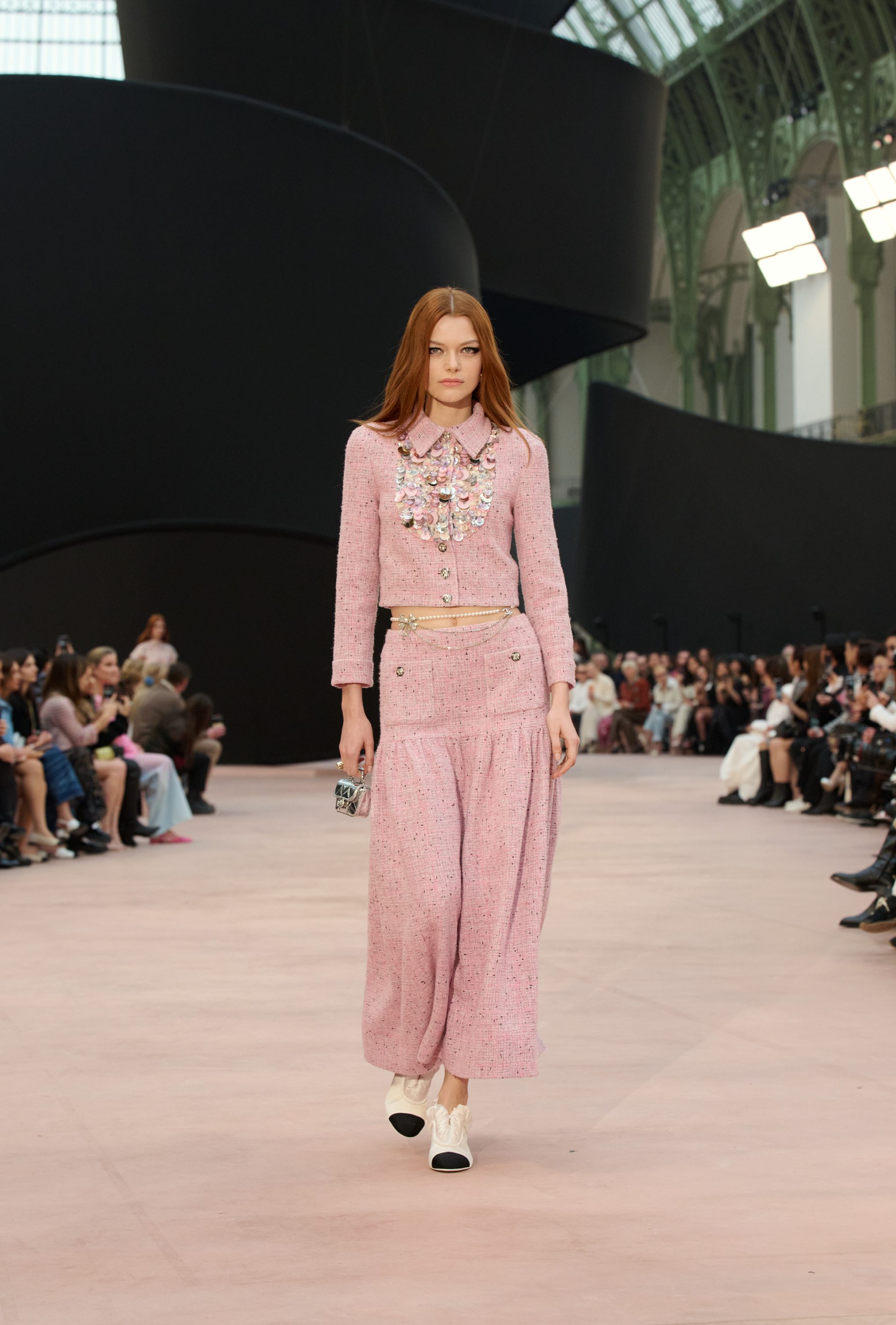Impalpabili abiti tunica indossati su completi bouclé, gorgiere di ruche, fiocchi e ancora look in vernice nera, perle bold e maxi pull in lana tricot sfilano alla Paris fashion Week sulla passerella Primavera/Estate 2025-2026 di Chanel