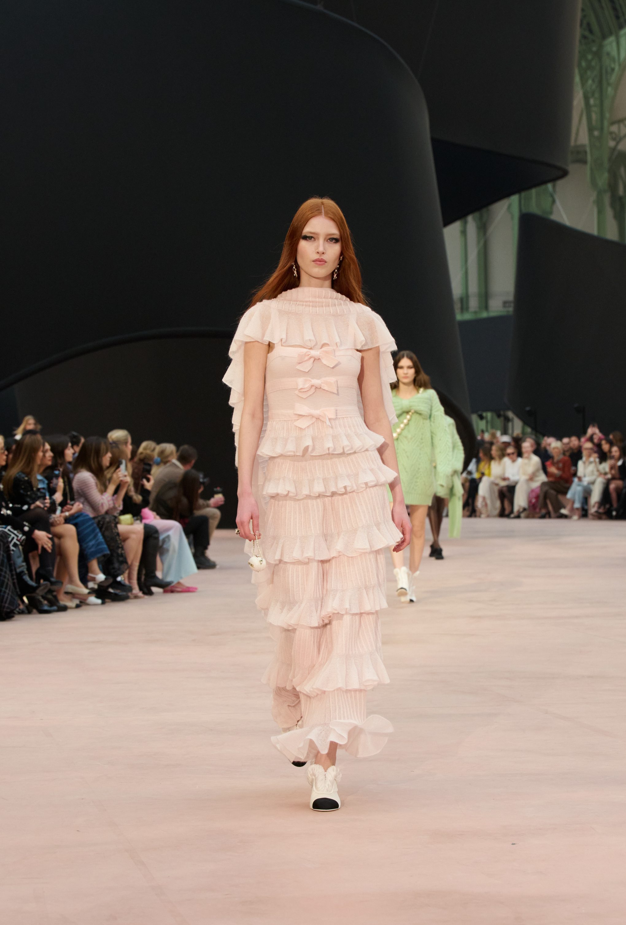 Impalpabili abiti tunica indossati su completi bouclé, gorgiere di ruche, fiocchi e ancora look in vernice nera, perle bold e maxi pull in lana tricot sfilano alla Paris fashion Week sulla passerella Primavera/Estate 2025-2026 di Chanel