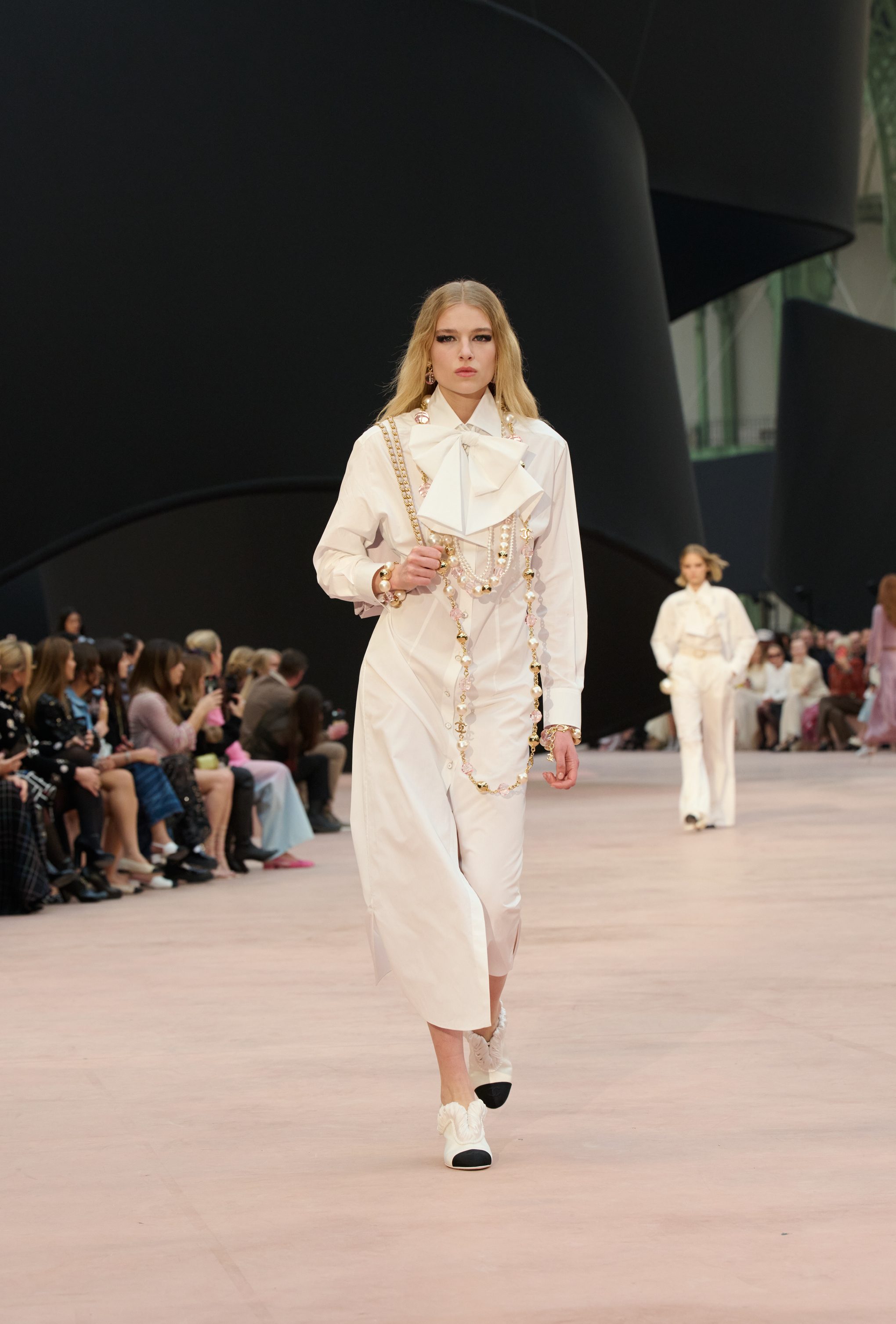 Impalpabili abiti tunica indossati su completi bouclé, gorgiere di ruche, fiocchi e ancora look in vernice nera, perle bold e maxi pull in lana tricot sfilano alla Paris fashion Week sulla passerella Primavera/Estate 2025-2026 di Chanel