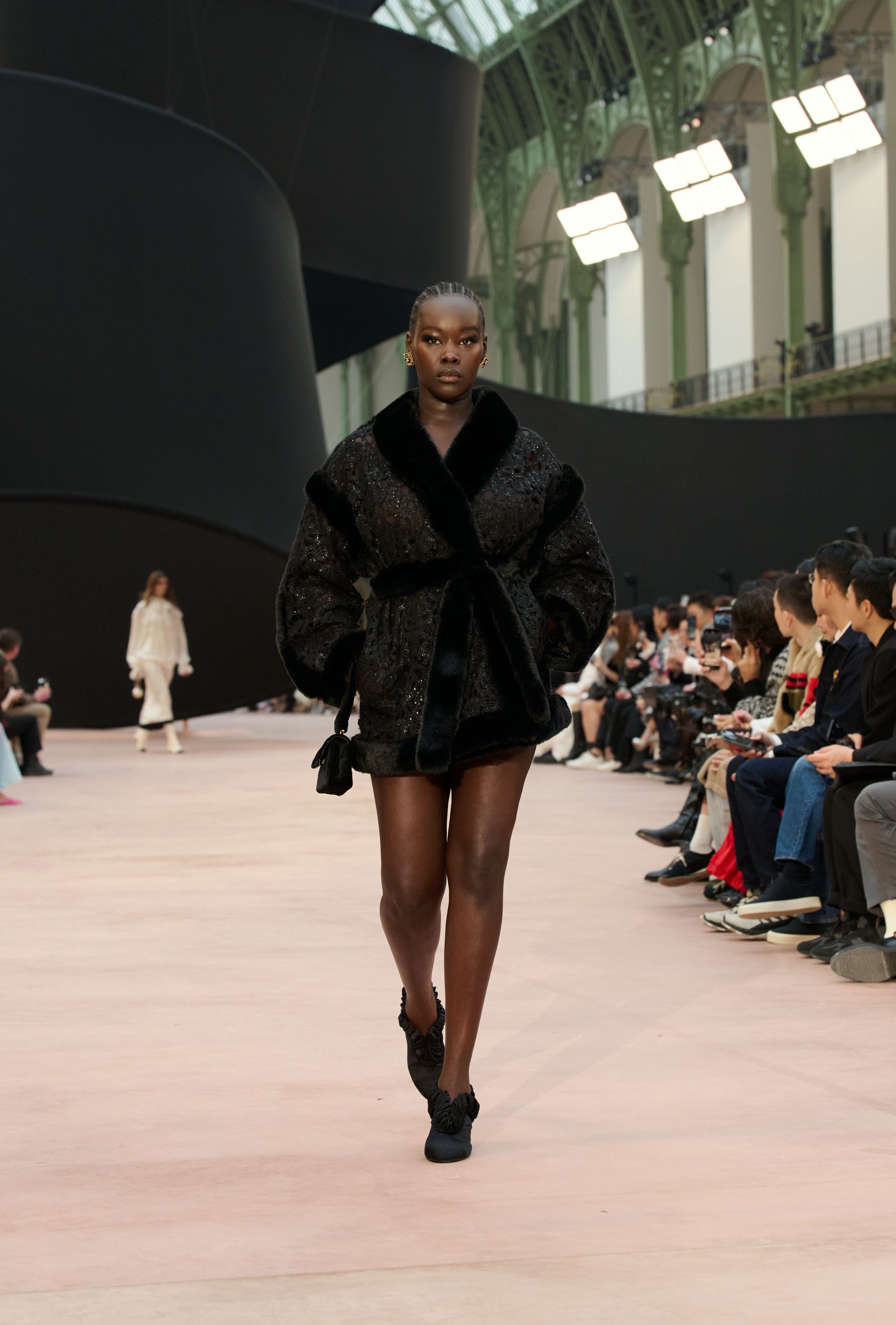 Impalpabili abiti tunica indossati su completi bouclé, gorgiere di ruche, fiocchi e ancora look in vernice nera, perle bold e maxi pull in lana tricot sfilano alla Paris fashion Week sulla passerella Primavera/Estate 2025-2026 di Chanel