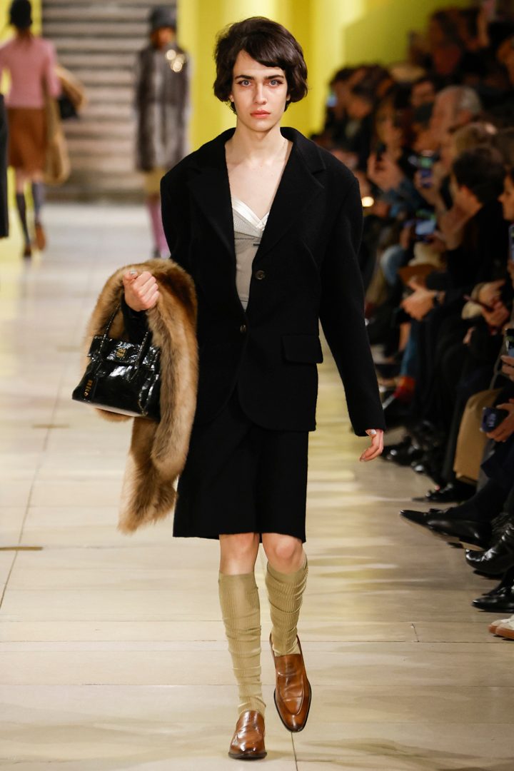 Stole in pelliccia, mocassini in cuoio, calzettoni in vista, tailleur in lana pesante, fantasie a quadri dal mood sixties, tute sportive e capi in lurex sfilano alla Paris Fashion Week sulla passerella Autunno/Inverno 2025-2026 di Miu Miu