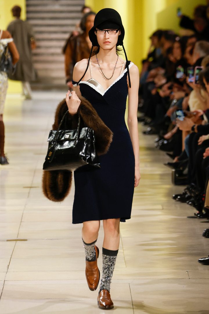Stole in pelliccia, mocassini in cuoio, calzettoni in vista, tailleur in lana pesante, fantasie a quadri dal mood sixties, tute sportive e capi in lurex sfilano alla Paris Fashion Week sulla passerella Autunno/Inverno 2025-2026 di Miu Miu