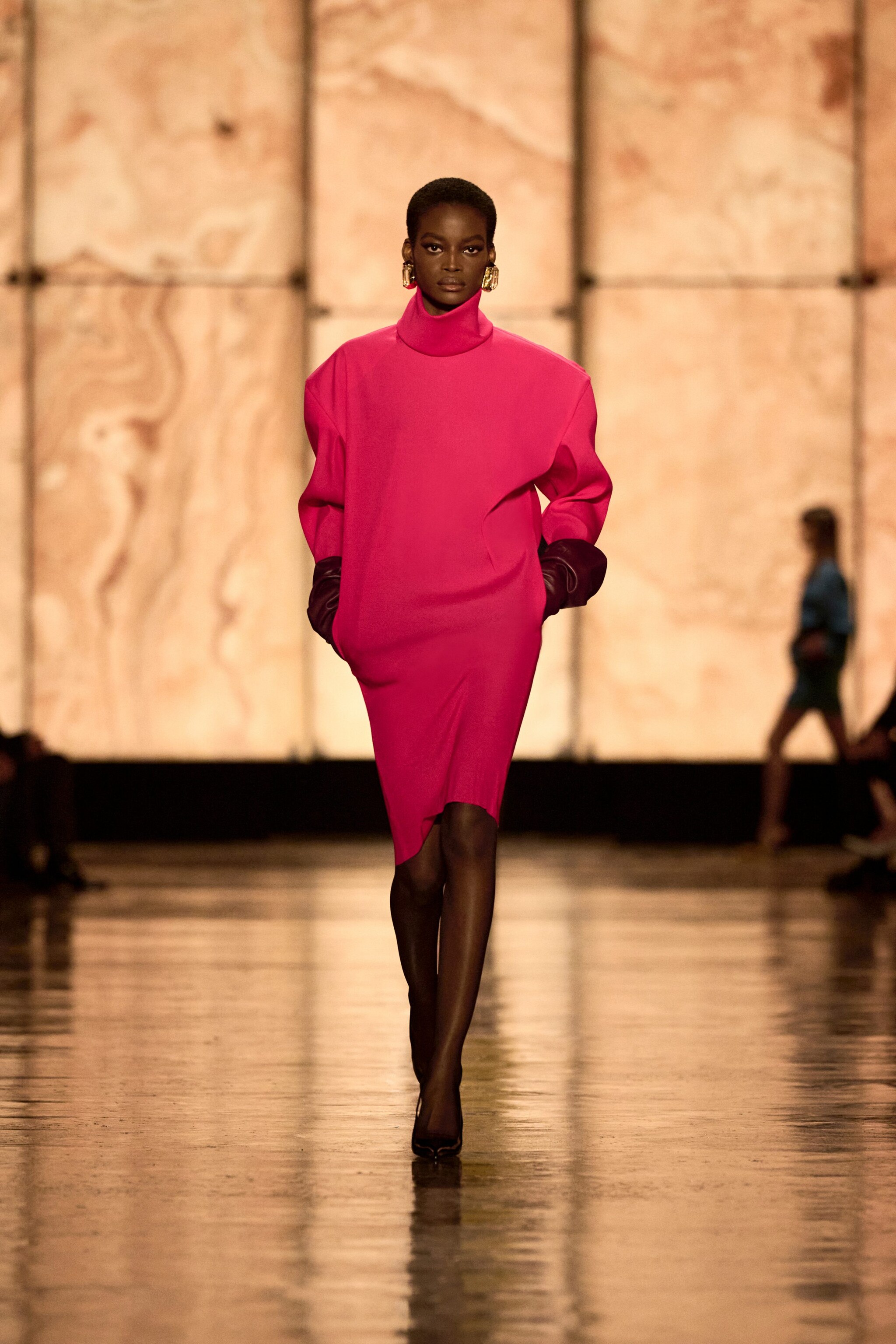 Blocchi di colore a contrasto, look in pizzo, abiti in pvc dalla stampa animalier e lunghi slipdress con gonne balloon sfilano alla Paris Fashion Week sulla passerella/Autunno/Inverno 2025-2026 di Saint Laurent