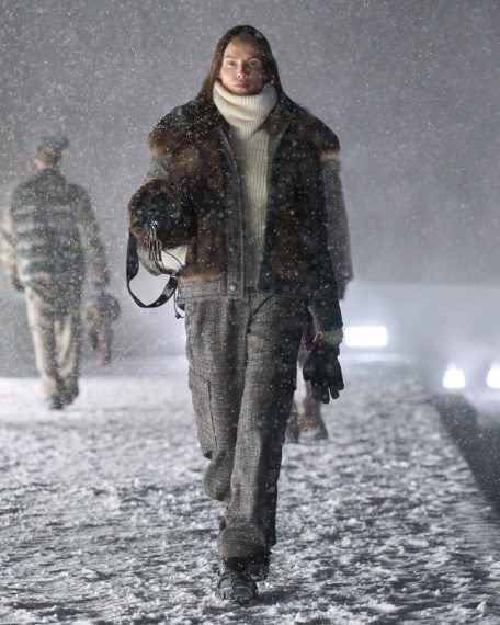 Completi in denim o in lana melange, cardigan e gonne jacquard o tricot e ancora pantaloni cargo e dettagli in shearling o pelliccia sfilano a Courchevel sulla passerella innevata di Moncler nella collezione Autunno/Inverno 2025-2026