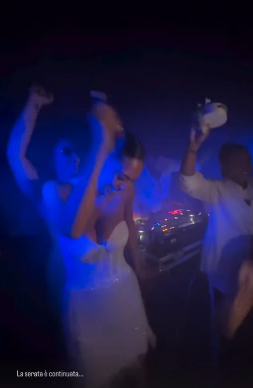 La sposa, nel giorno del sì, ha indossato tre abiti: uno in pizzo per la cerimonia religiosa in Chiesa, uno con scollo all'americana per il taglio della torta e un minidress per il party conclusivo con gli amici, perfetto per ballare tutta la notte.