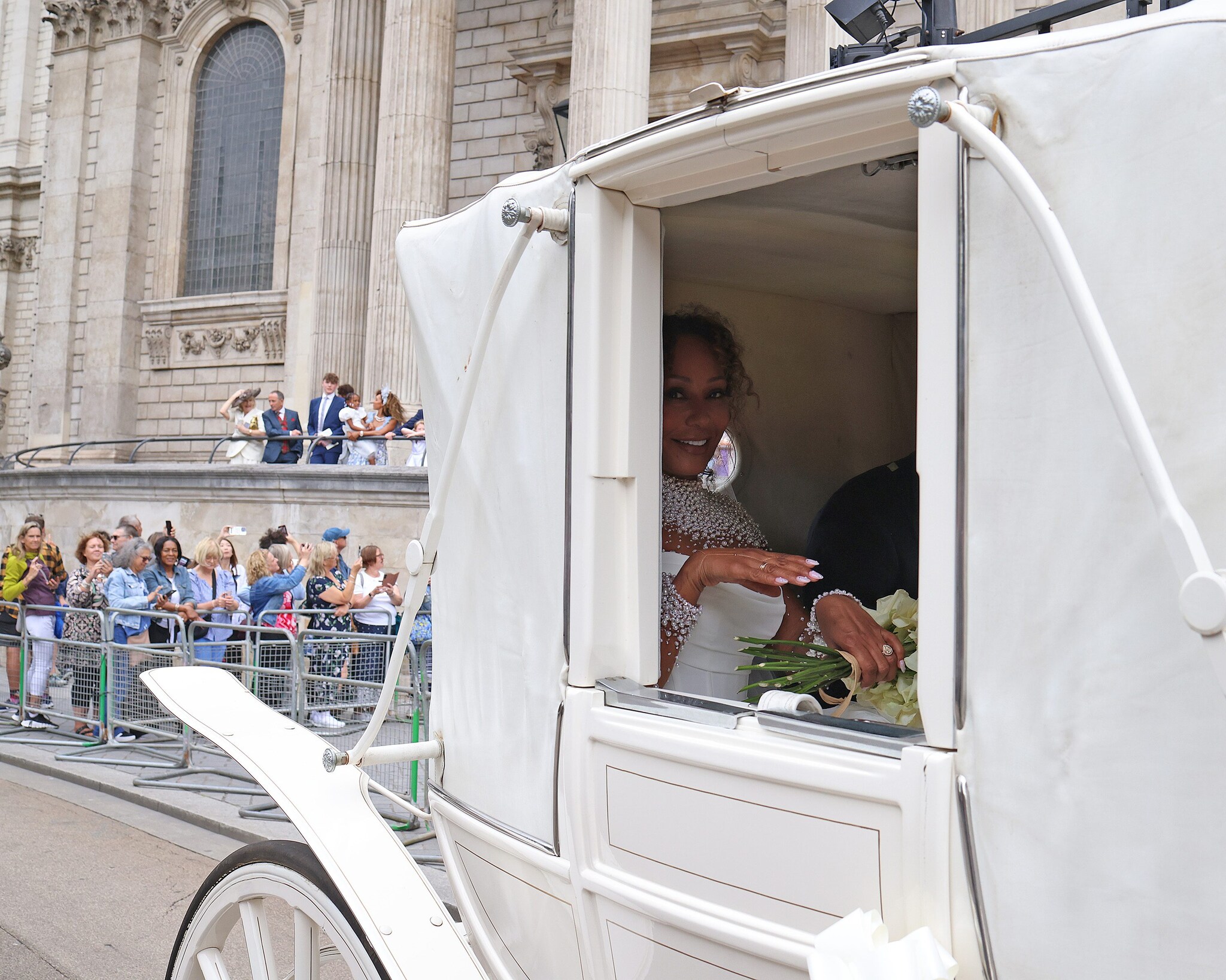Melanie Brown, alias Mel B delle Spice Girls, si è sposata a Londra indossando un lungo abito a sirena bianco, abbinato a preziosi gioielli in perle e diamanti, ecco tutte le foto dell'abito da sposa e dei look scelti dagli invitati Vip al matrimonio, tra cui Emma Bunton e Cara Delevingne