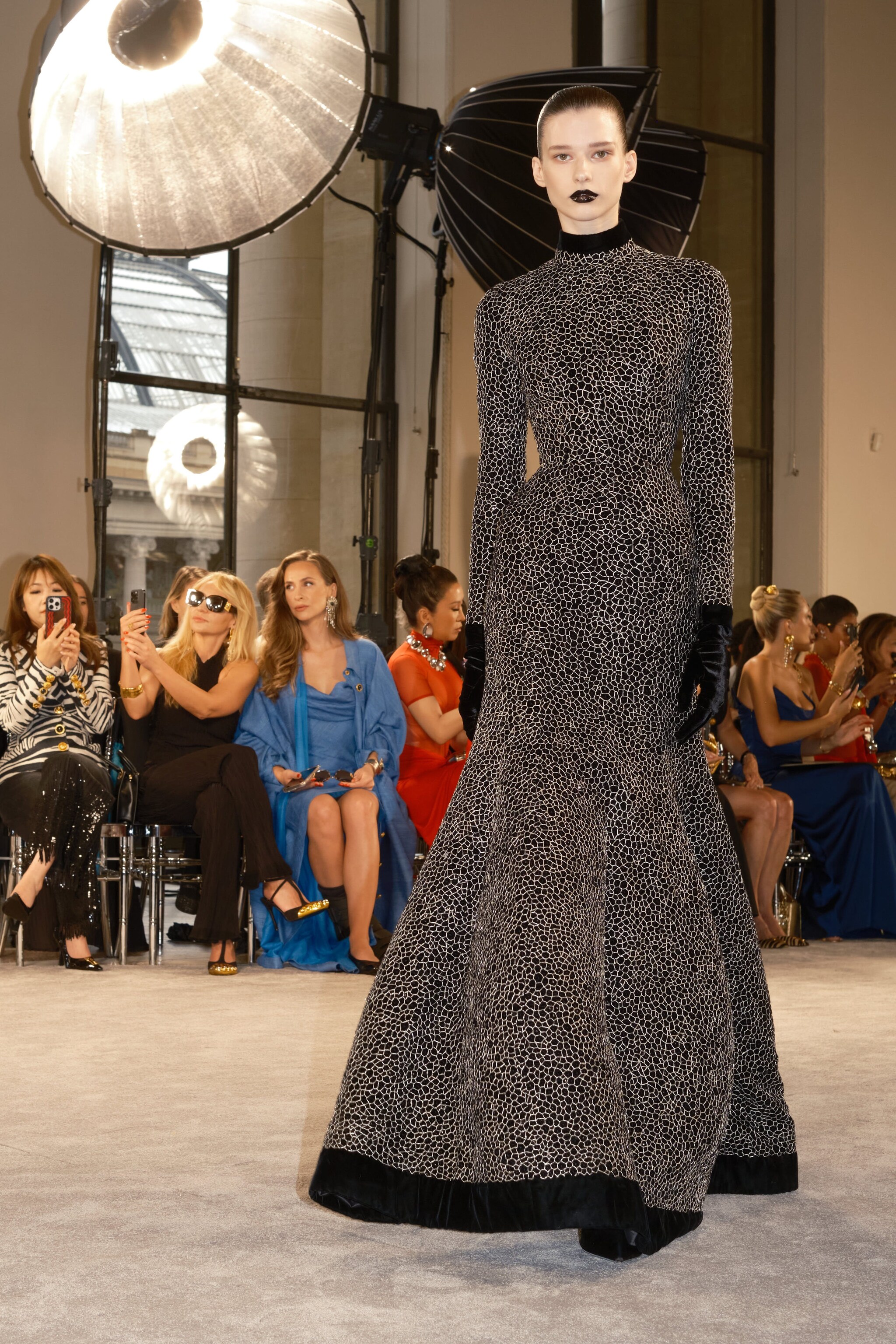 Sinuose linee scultoree, inserti con vaporose rouche in tulle, look in stile torero, abiti con inserti futuristici e look in total rouge sfilano a Parigi sulla passerella Haute Couture Autunno/Inverno 25-26 di Schiaparelli