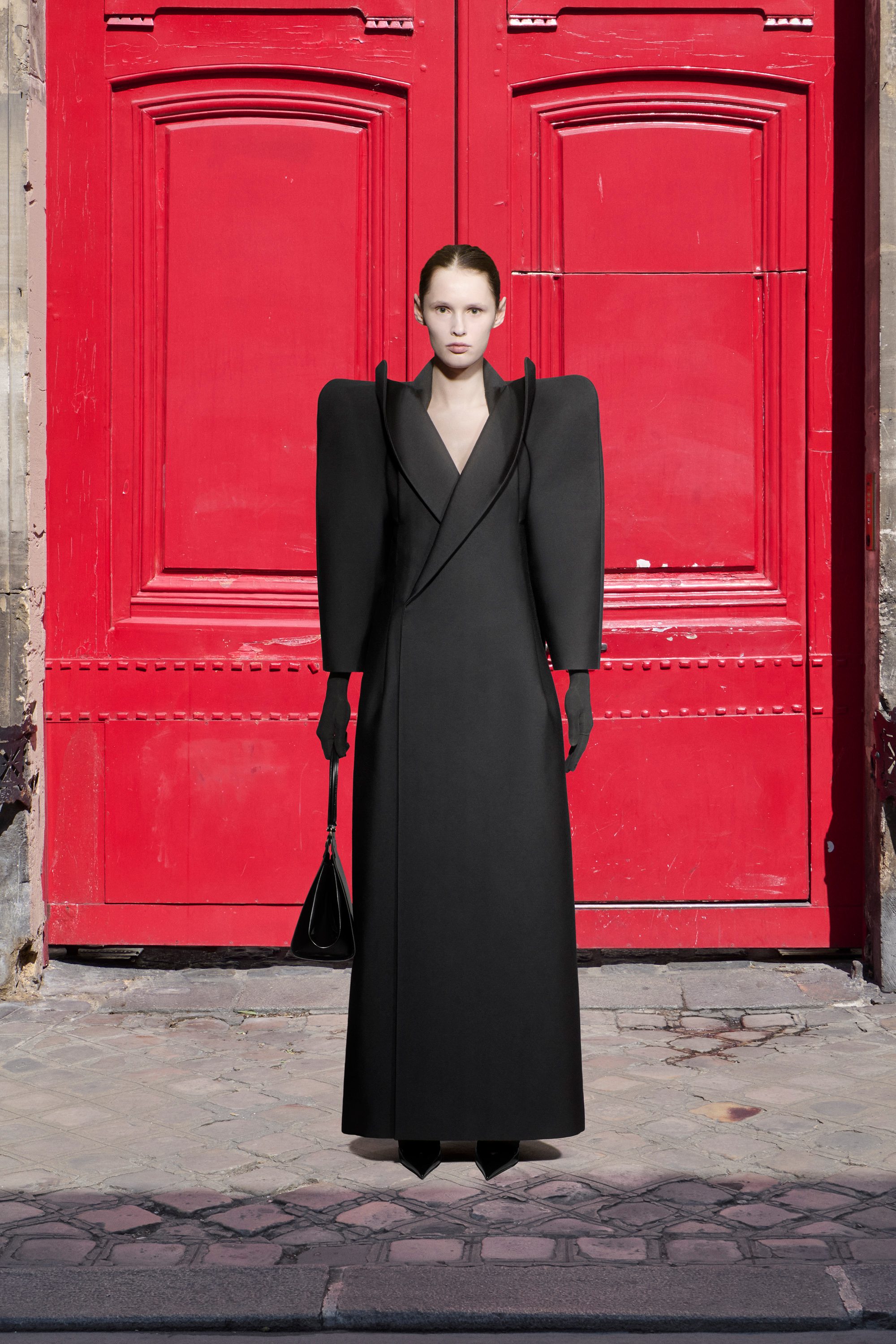 Sfila alla Settimana dell'Alta Moda di Parigi la collezione Haute Couture Autunno/Inverno 2025-2026 di Balenciaga, l'ultima firmata da Demna. In passerella appaiono le icone e i feticci del designer, dalle linee esagerate e drammatiche di abiti da sera scultorei e di completi con blazer e pantaloni oversize, ai bomber street style, fino ai piumini e agli abiti in pelle nera con spalline appuntite