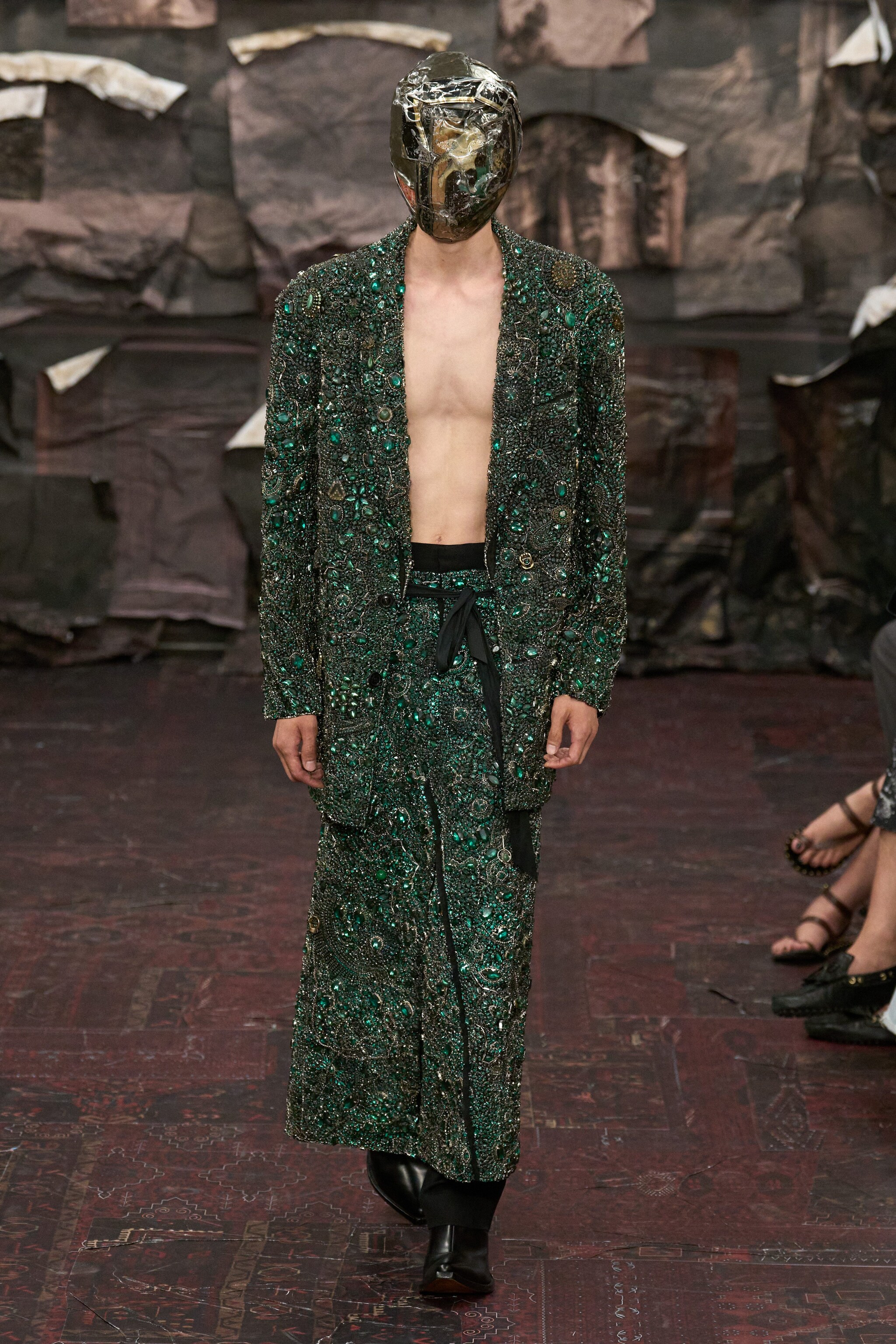 Tessuti che sembrano stropicciati, copri abiti trasparenti in pvc, gonne coperte di piume, ruche in seta, soavi abiti nudi e maschere che coprono il volto sfilano alla Settimana dell'Alta Moda di Parigi sulla passerella Couture Autunno/Inverno 2025-2025 di Maison Margiela Artisanal