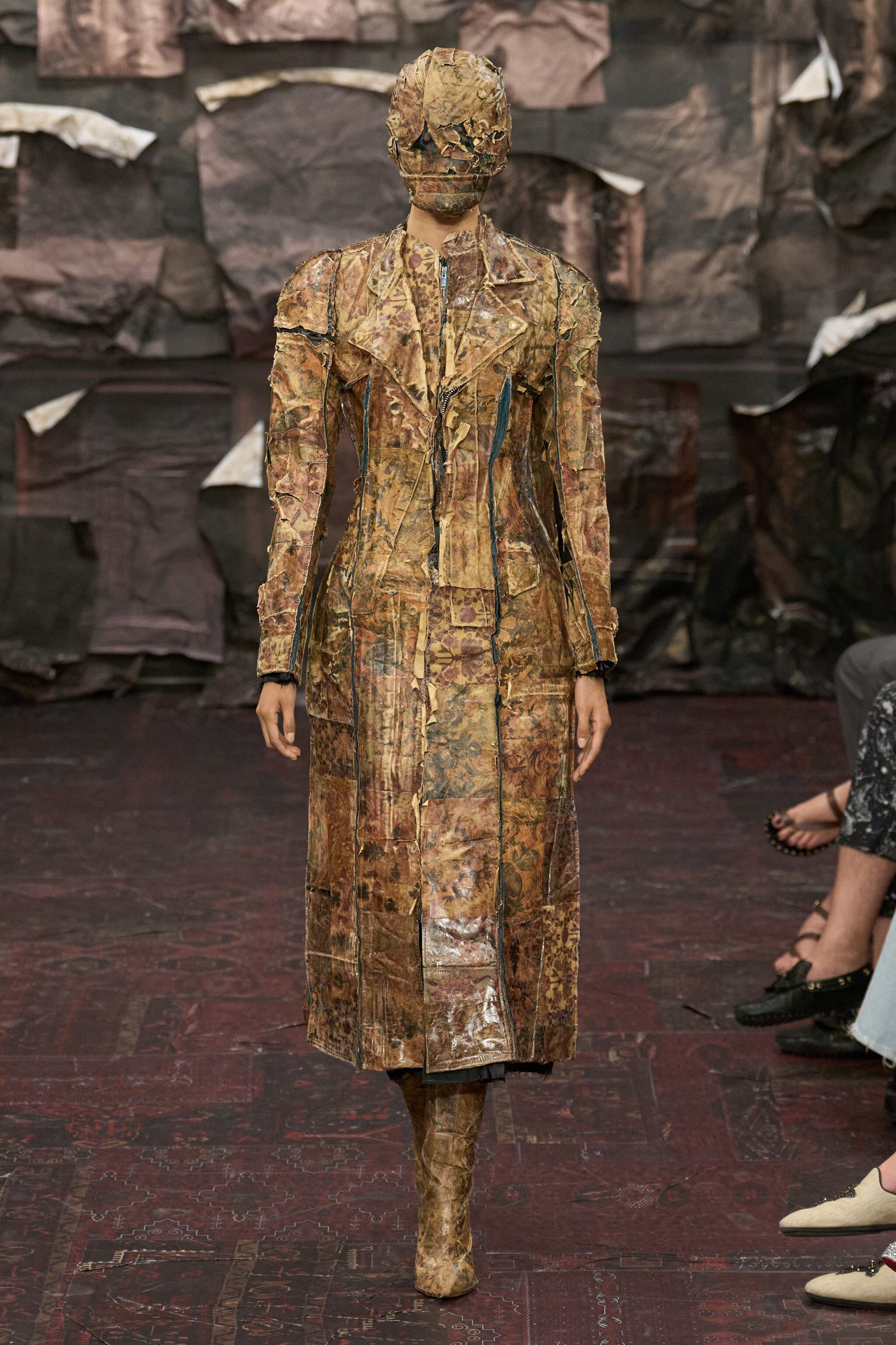 Tessuti che sembrano stropicciati, copri abiti trasparenti in pvc, gonne coperte di piume, ruche in seta, soavi abiti nudi e maschere che coprono il volto sfilano alla Settimana dell'Alta Moda di Parigi sulla passerella Couture Autunno/Inverno 2025-2025 di Maison Margiela Artisanal