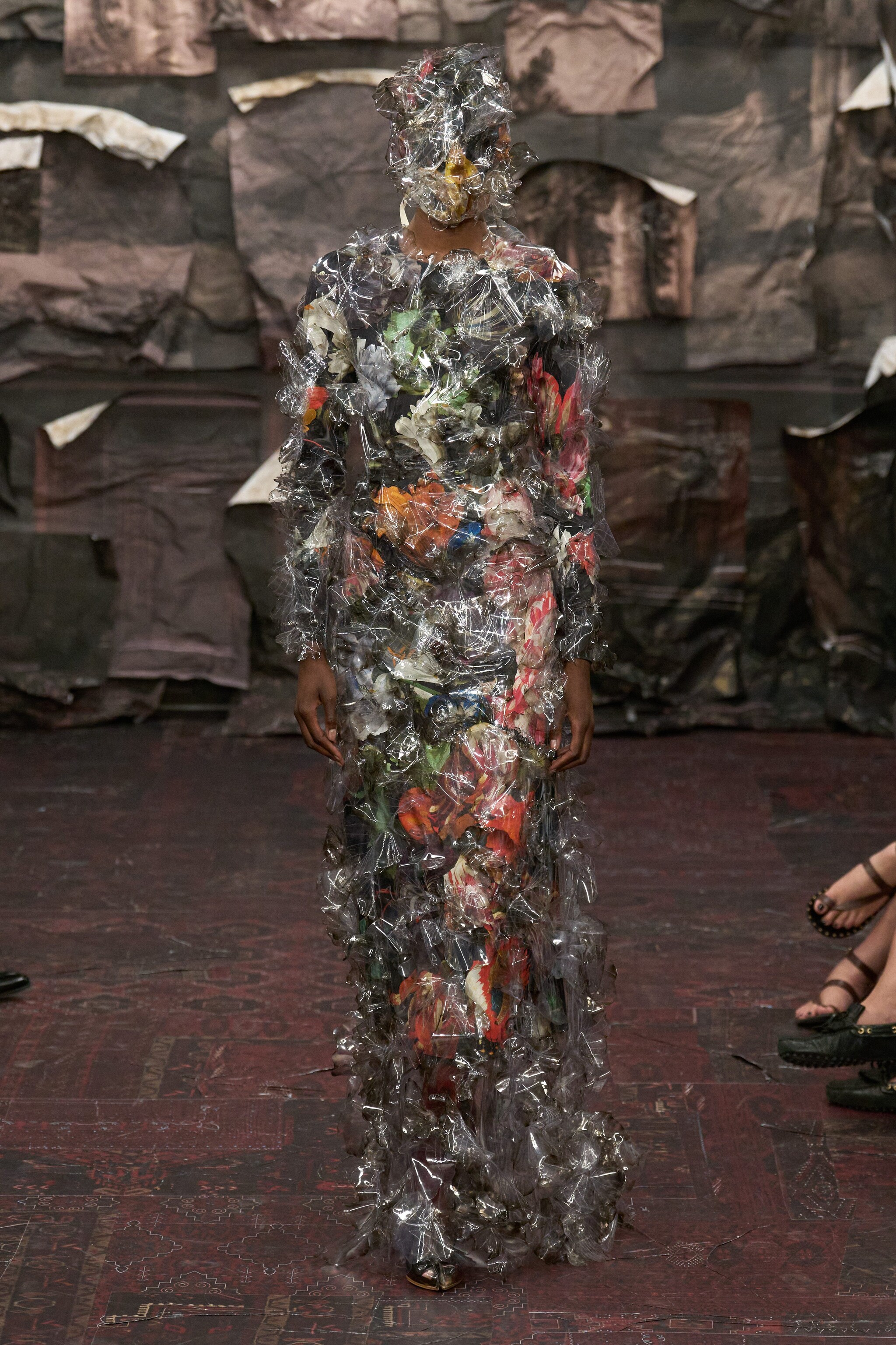 Tessuti che sembrano stropicciati, copri abiti trasparenti in pvc, gonne coperte di piume, ruche in seta, soavi abiti nudi e maschere che coprono il volto sfilano alla Settimana dell'Alta Moda di Parigi sulla passerella Couture Autunno/Inverno 2025-2025 di Maison Margiela Artisanal