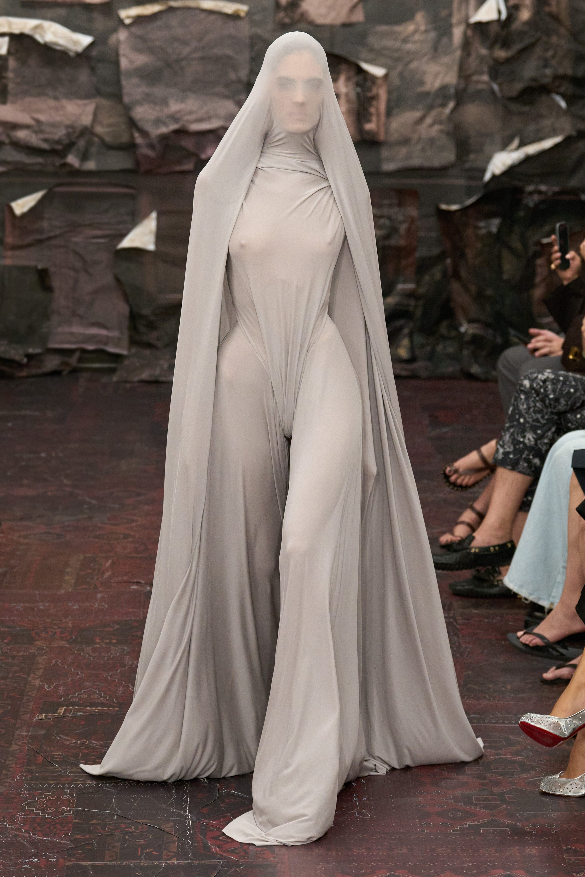 Tessuti che sembrano stropicciati, copri abiti trasparenti in pvc, gonne coperte di piume, ruche in seta, soavi abiti nudi e maschere che coprono il volto sfilano alla Settimana dell'Alta Moda di Parigi sulla passerella Couture Autunno/Inverno 2025-2025 di Maison Margiela Artisanal