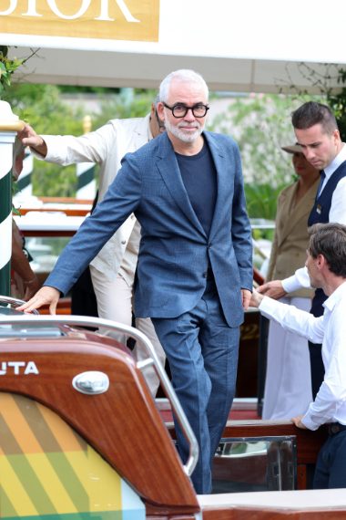 Elisabetta Gregoraci arriva a Venezia: look color nude con sciarpetta a effetto strascico
