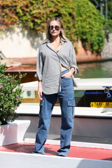 Elisabetta Gregoraci arriva a Venezia: look color nude con sciarpetta a effetto strascico