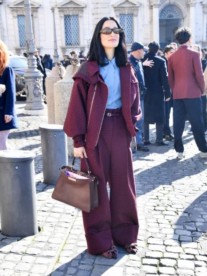 • Vittoria Ceretti con cappotto Ferragamo e borsa Gucci