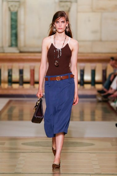Gonne in pelle a vita bassa, morbide polo, abiti stropicciati, power suit fantasia e tocchi di colore, dal giallo burro al ceruleo, sfilano a New York sulla passerella Primavera/Estate 2026 di Tory Burch