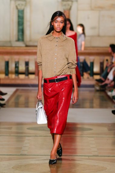 Gonne in pelle a vita bassa, morbide polo, abiti stropicciati, power suit fantasia e tocchi di colore, dal giallo burro al ceruleo, sfilano a New York sulla passerella Primavera/Estate 2026 di Tory Burch
