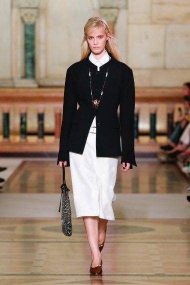 Gonne in pelle a vita bassa, morbide polo, abiti stropicciati, power suit fantasia e tocchi di colore, dal giallo burro al ceruleo, sfilano a New York sulla passerella Primavera/Estate 2026 di Tory Burch