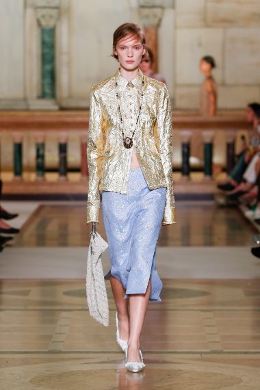 Gonne in pelle a vita bassa, morbide polo, abiti stropicciati, power suit fantasia e tocchi di colore, dal giallo burro al ceruleo, sfilano a New York sulla passerella Primavera/Estate 2026 di Tory Burch