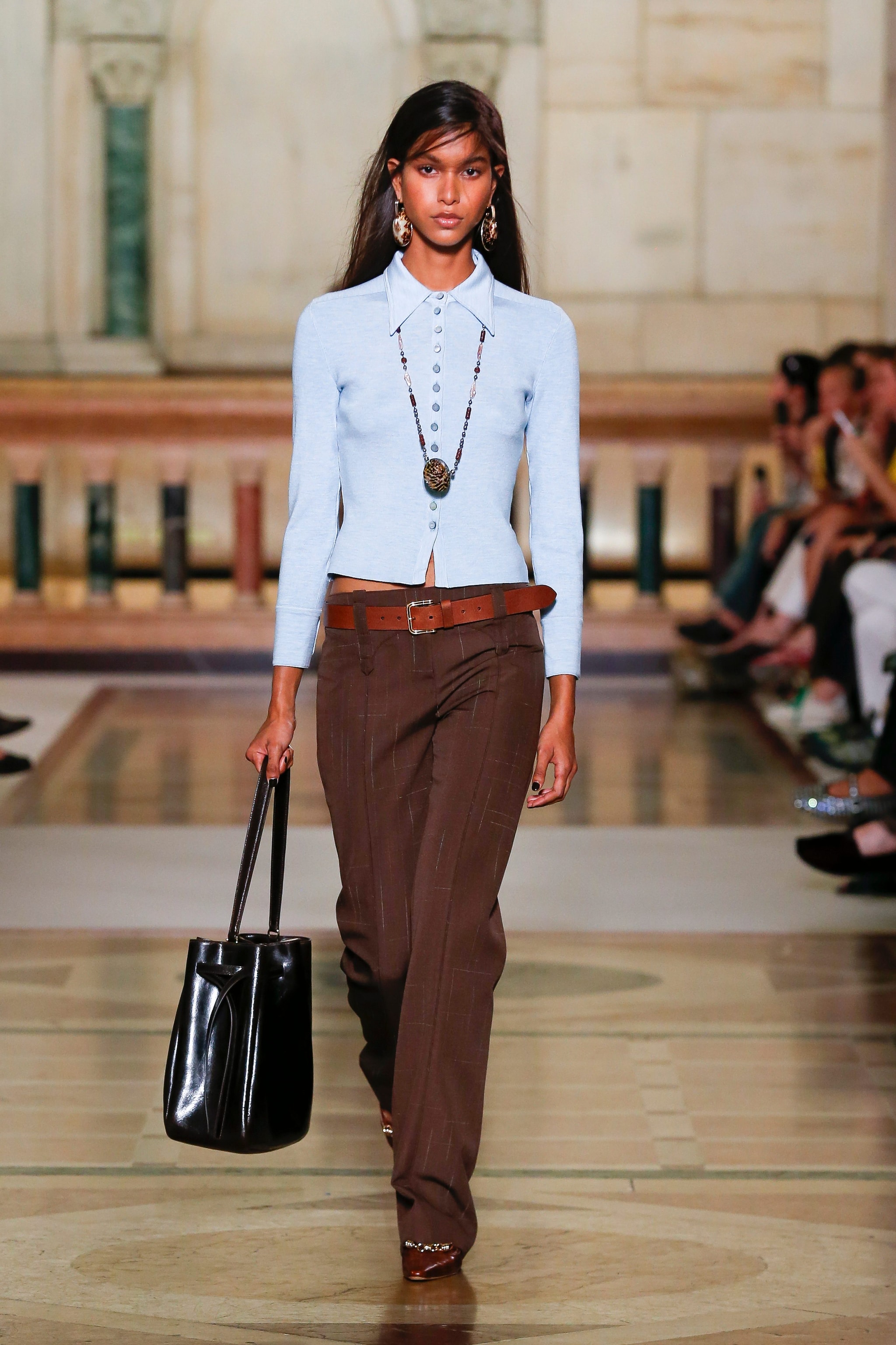 Gonne in pelle a vita bassa, morbide polo, abiti stropicciati, power suit fantasia e tocchi di colore, dal giallo burro al ceruleo, sfilano a New York sulla passerella Primavera/Estate 2026 di Tory Burch
