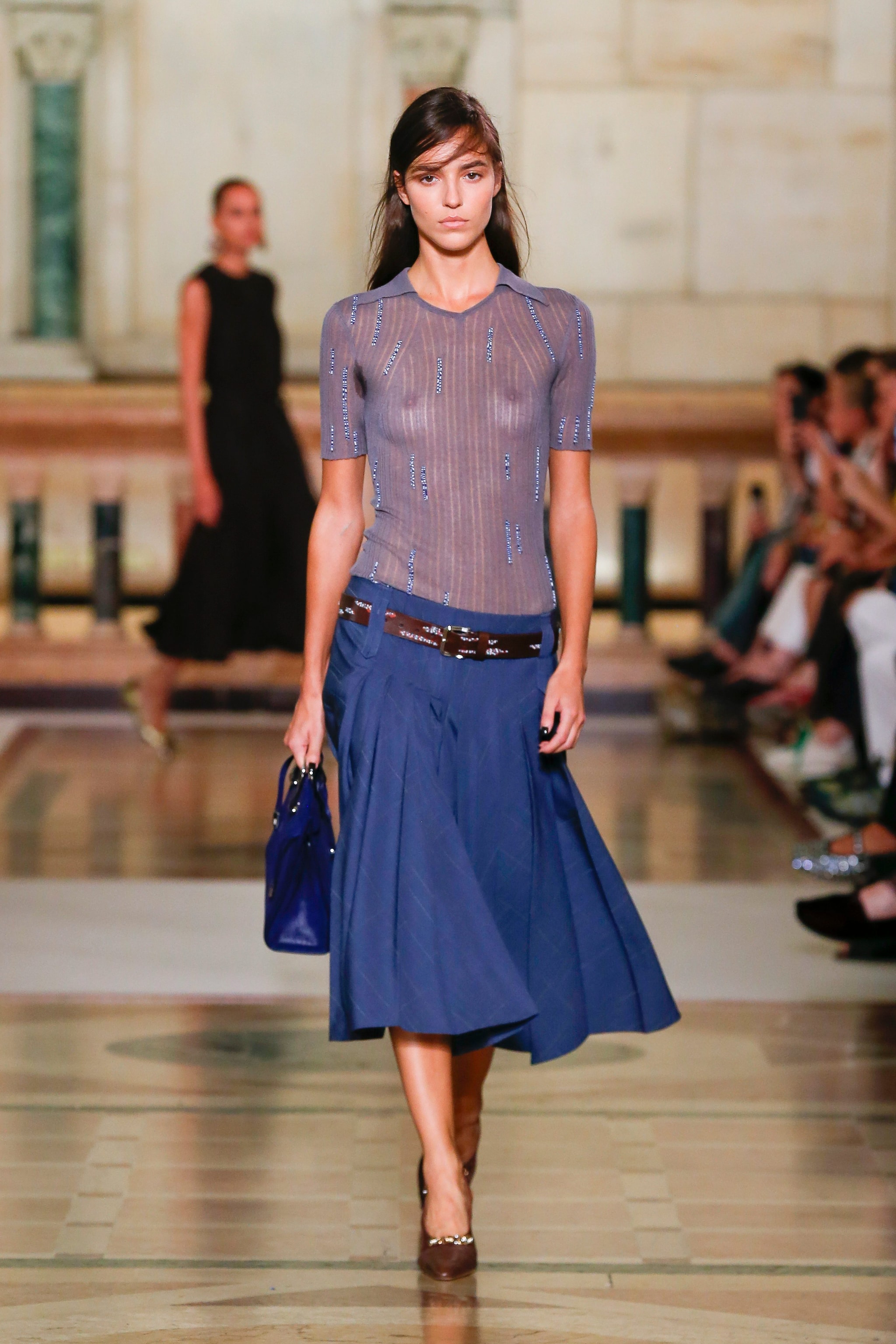 Gonne in pelle a vita bassa, morbide polo, abiti stropicciati, power suit fantasia e tocchi di colore, dal giallo burro al ceruleo, sfilano a New York sulla passerella Primavera/Estate 2026 di Tory Burch