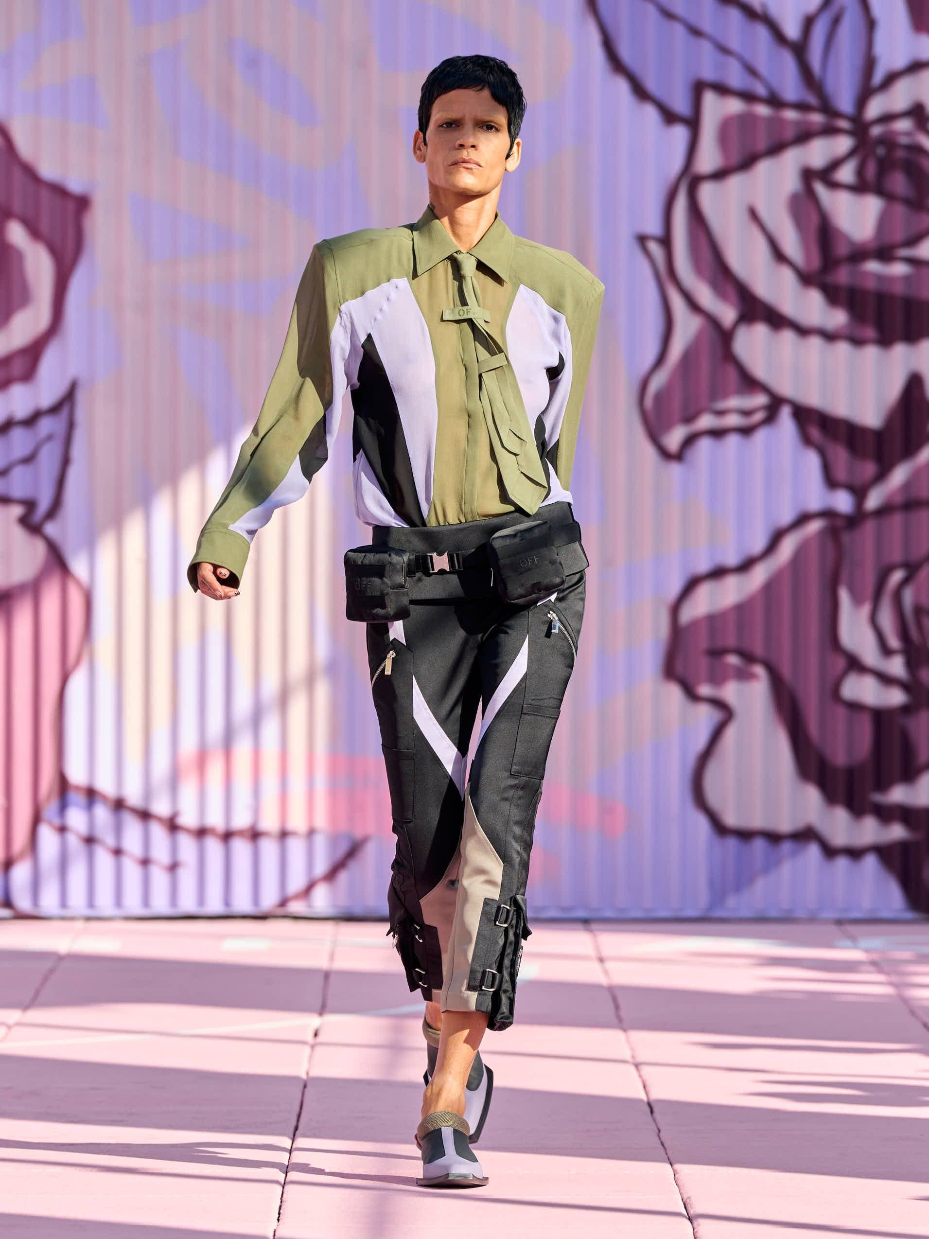 Capi a blocchi di colore e sfumature tie dye, completi in denim, body cut out e look multi tasche sfilano a New York sulla passerella Primavera/Estate 2026 di Off White