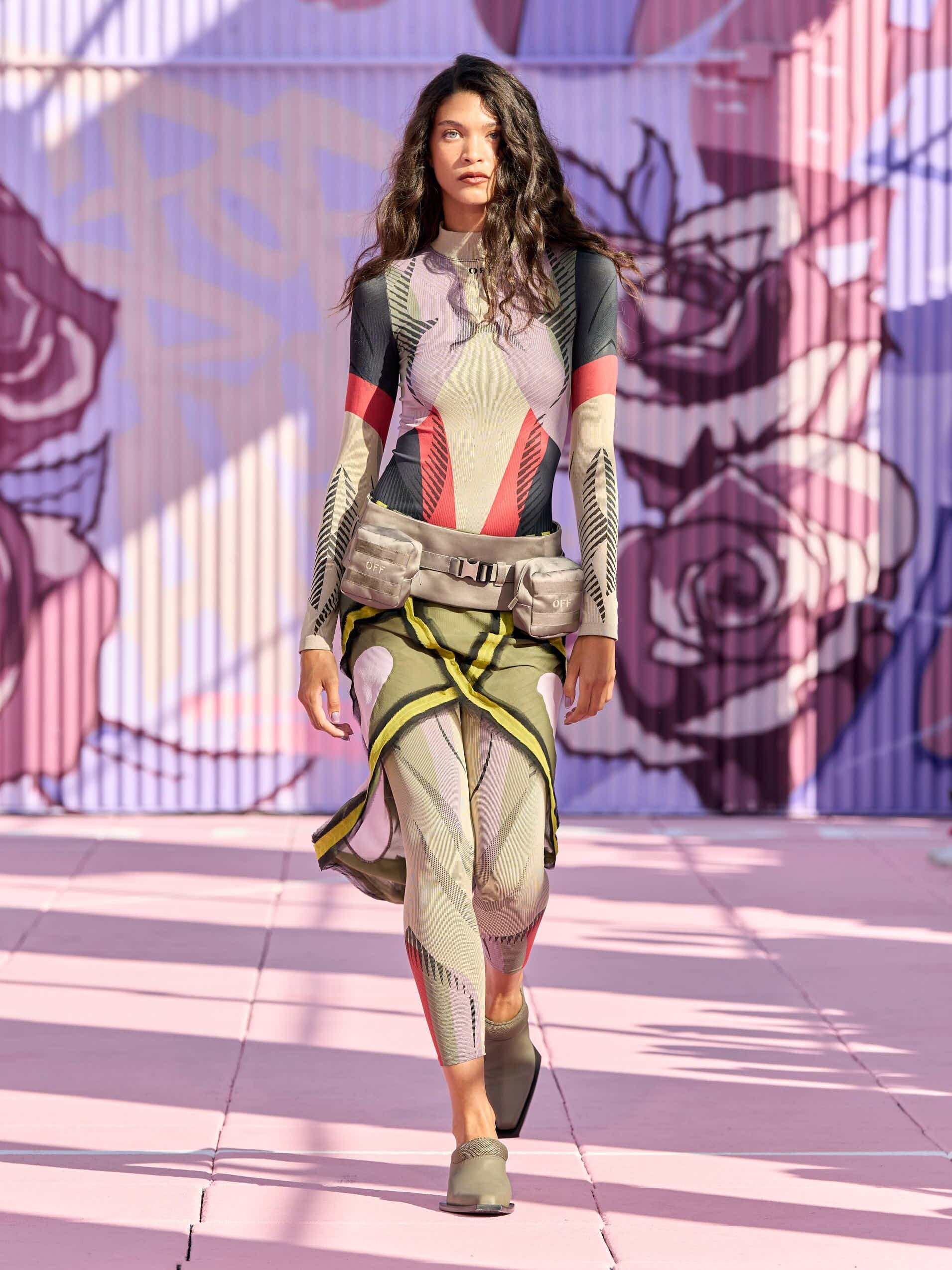 Capi a blocchi di colore e sfumature tie dye, completi in denim, body cut out e look multi tasche sfilano a New York sulla passerella Primavera/Estate 2026 di Off White
