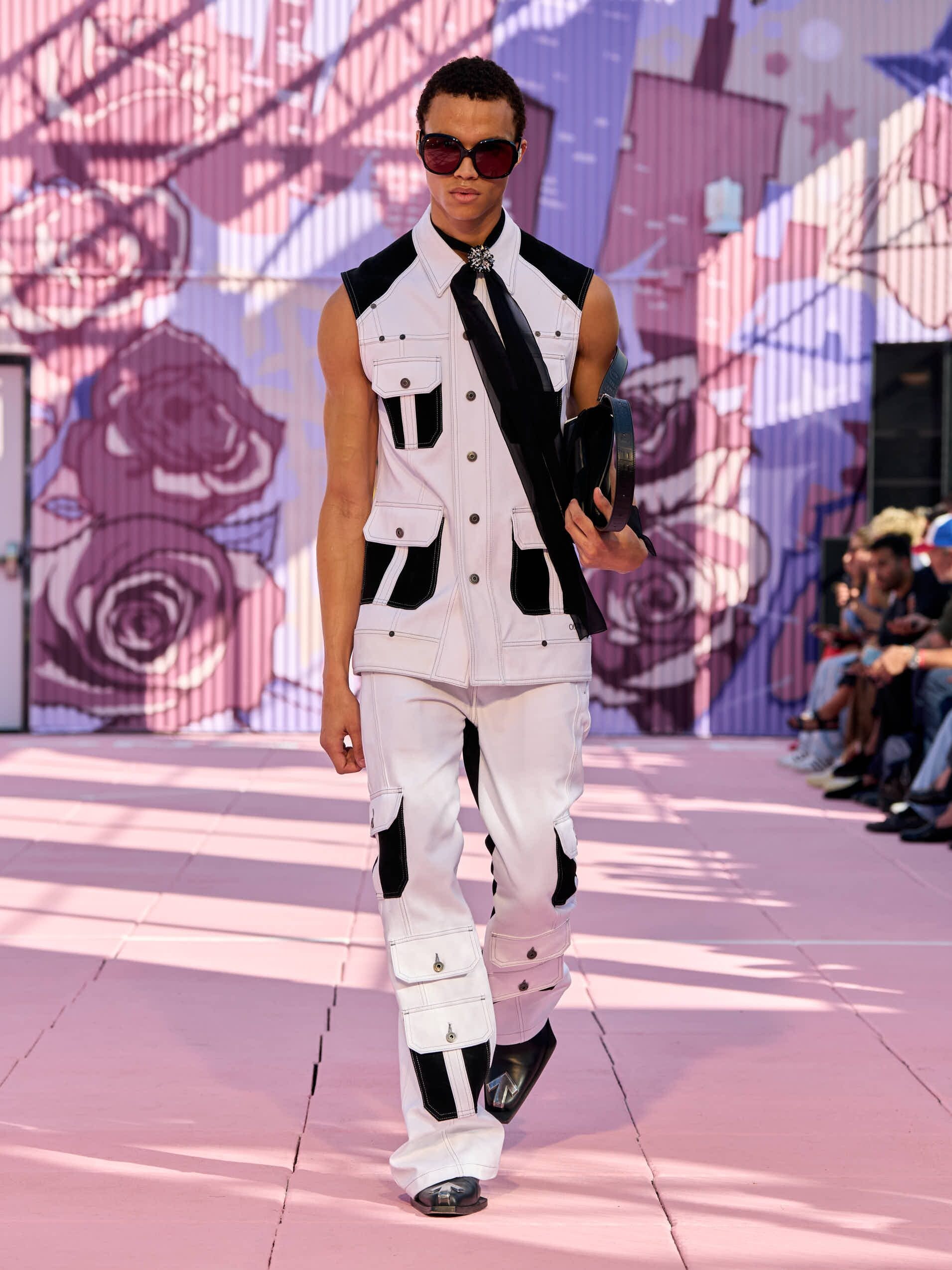 Capi a blocchi di colore e sfumature tie dye, completi in denim, body cut out e look multi tasche sfilano a New York sulla passerella Primavera/Estate 2026 di Off White