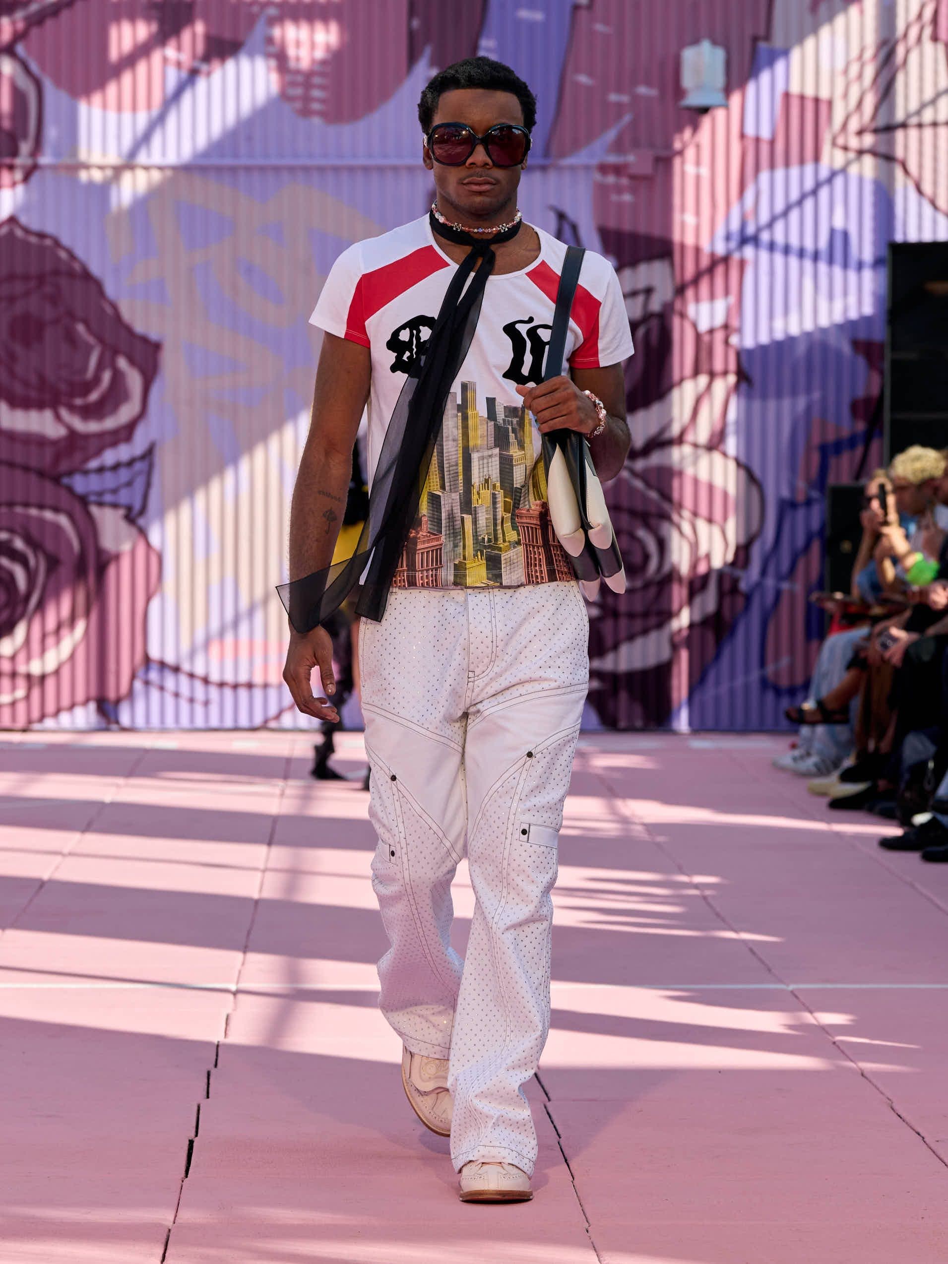 Capi a blocchi di colore e sfumature tie dye, completi in denim, body cut out e look multi tasche sfilano a New York sulla passerella Primavera/Estate 2026 di Off White
