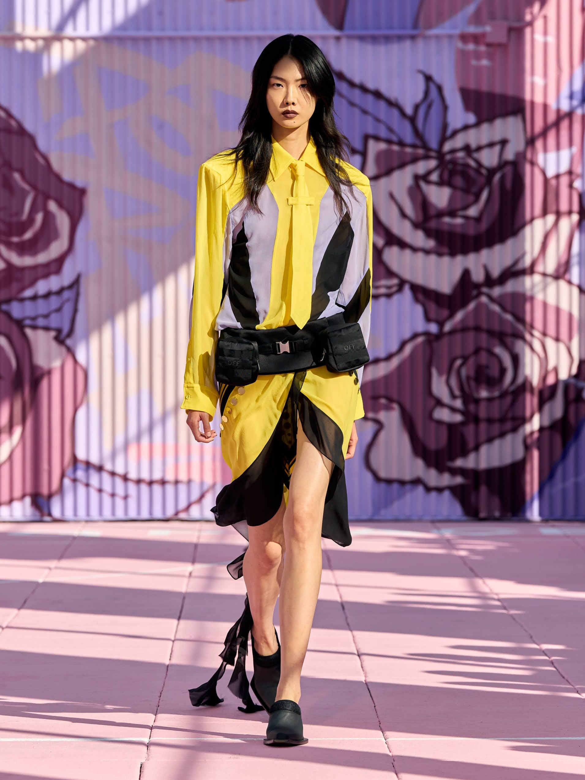 Capi a blocchi di colore e sfumature tie dye, completi in denim, body cut out e look multi tasche sfilano a New York sulla passerella Primavera/Estate 2026 di Off White