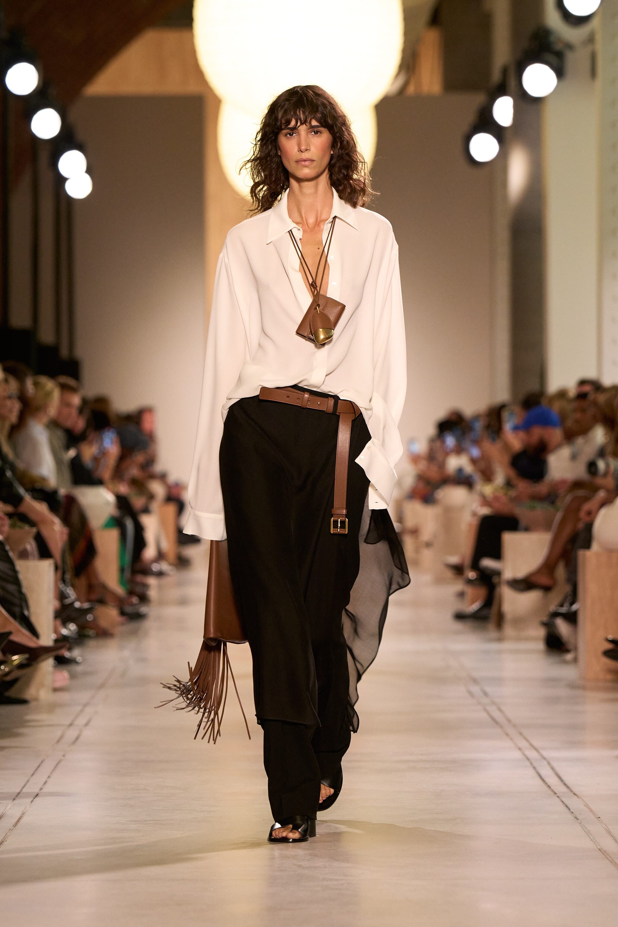 Sinuosi drappeggi e abiti foulard, modelli kimono o con gonne simmetriche e ancora suits oversize, fantasie rigate e accenti di rosa sfilano a New York sulla passerella Primavera/Estate 2026 di Michael Kors Collection