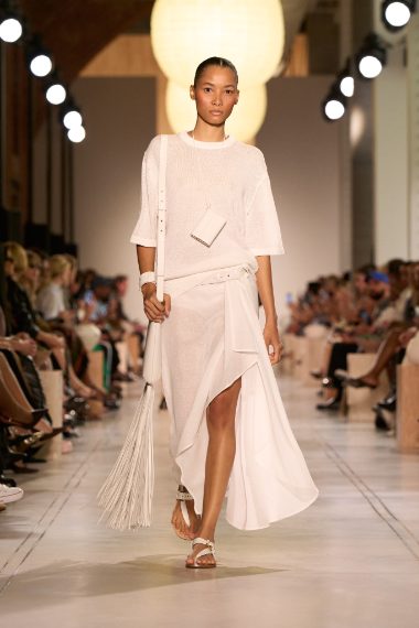 Sinuosi drappeggi e abiti foulard, modelli kimono o con gonne simmetriche e ancora suits oversize, fantasie rigate e accenti di rosa sfilano a New York sulla passerella Primavera/Estate 2026 di Michael Kors Collection