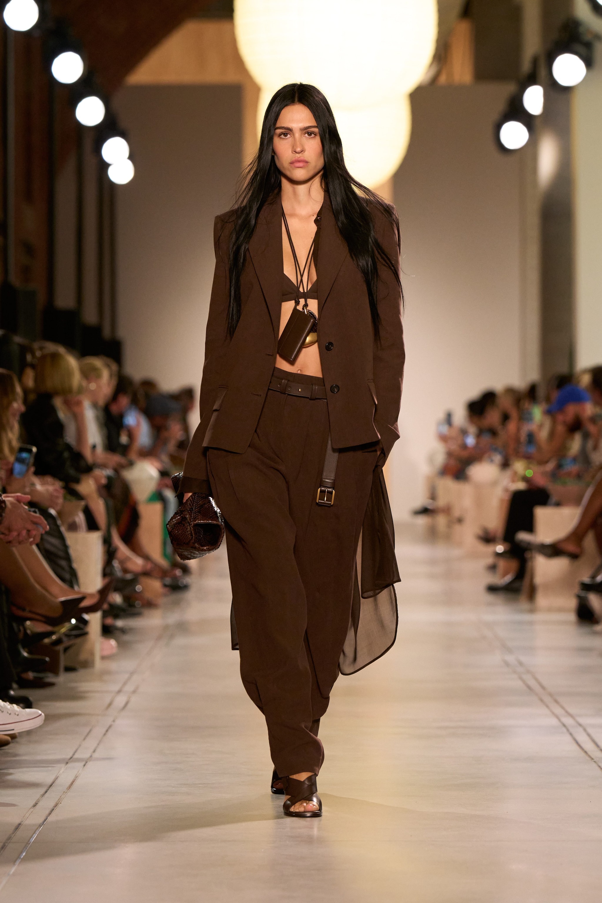 Sinuosi drappeggi e abiti foulard, modelli kimono o con gonne simmetriche e ancora suits oversize, fantasie rigate e accenti di rosa sfilano a New York sulla passerella Primavera/Estate 2026 di Michael Kors Collection