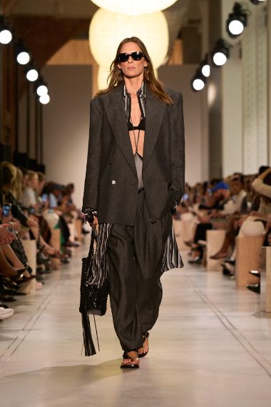 Sinuosi drappeggi e abiti foulard, modelli kimono o con gonne simmetriche e ancora suits oversize, fantasie rigate e accenti di rosa sfilano a New York sulla passerella Primavera/Estate 2026 di Michael Kors Collection