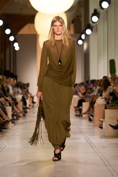 Sinuosi drappeggi e abiti foulard, modelli kimono o con gonne simmetriche e ancora suits oversize, fantasie rigate e accenti di rosa sfilano a New York sulla passerella Primavera/Estate 2026 di Michael Kors Collection